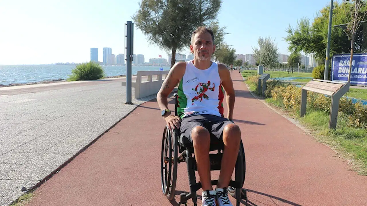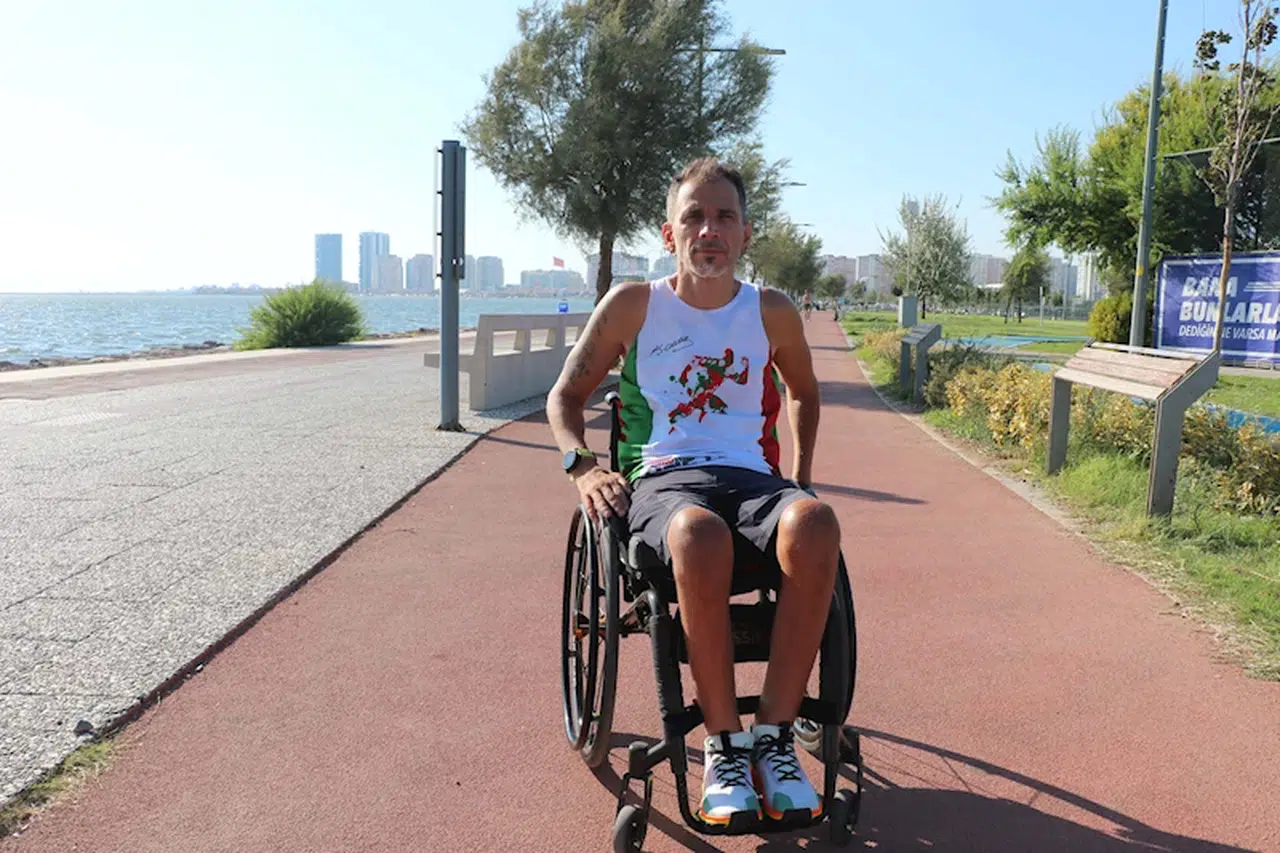 Yağmur ÖNGÜN/İZMİR, (DHA)- İZMİR'de yaşlı bir kadına yardım etmek için denize balıklama atlayınca boynunu kırarak omurilik felci olan ve doktorların 'Sandalyede bile oturamaz' dediği Okan Aracagök (45), azmiyle dikkat çekiyor. Basketbol ve yüzme gibi sporların yanı sıra maratonlara katılıp, çeşitli başarılar elde eden Aracagök, "2025 yılında Amsterdam maratonunda 3 saatin altında koşmayı hedefliyoruz" dedi.