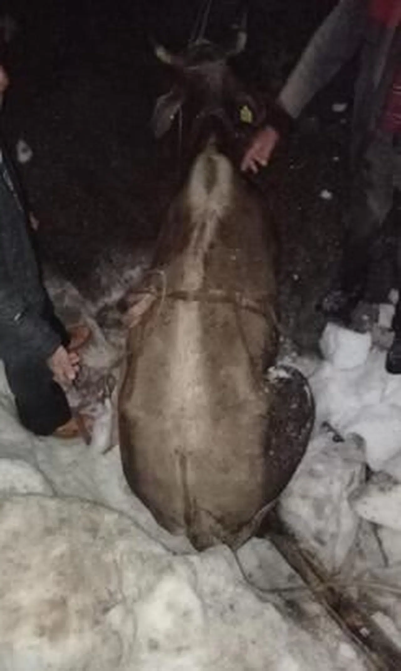 Büyükbaş hayvanı arama çalışmalarına katılan muhtar Ebubekir Pehlevan, “İneğin yerini gece saat 22.00 sıralarında tespit ettik. Kar üzerinden karşıya geçerken, kar kütlesinin çökmesiyle dere yatağındaki karlar arasında sıkışmıştı. İneğin yanına gidip ip attık, sırıkla müdahale ettik. Uzun uğraşlar sonucunda ineği sıkıştığı kar kütleleri arasından kurtardık. Oldukça bitkin haldeydi. Yürüyemez halde olduğu için ineği önce kesmeye karar verdik, daha sonra vazgeçtik” dedi.