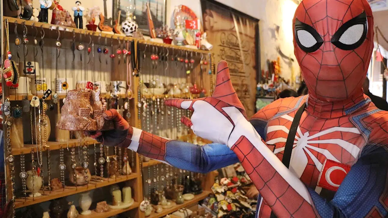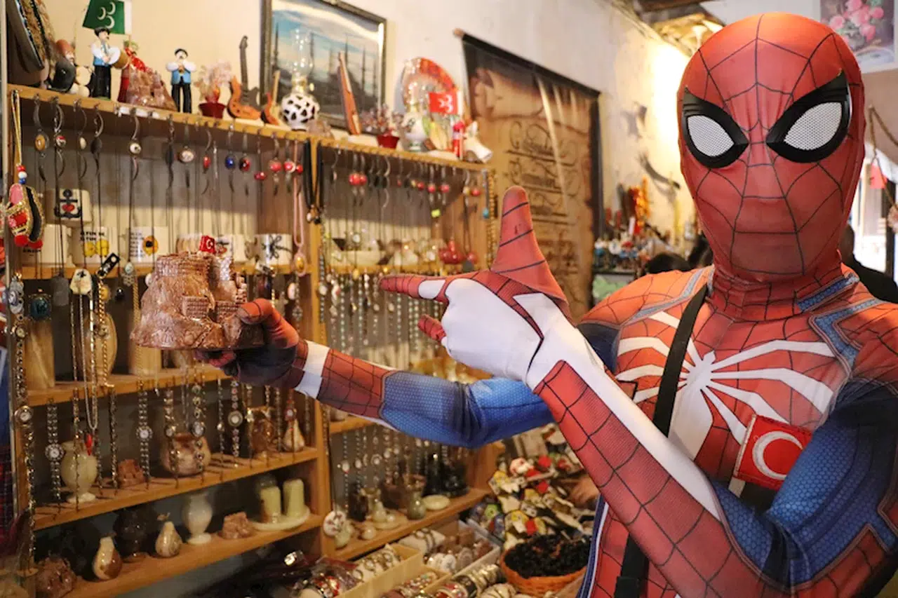 Ali Fuat GÜÇLÜER/AFYONKARAHİSAR, (DHA)- 'ÖRÜMCEK adam' kostümü ve pijamasıyla Türkiye'yi gezmek için yola çıkan, kendisini 'yerli pijamalı örümcek adam' olarak tanıtan Ayaz Salih Koç'un 47'nci durağı, Afyonkarahisar oldu. Kentin tarihi ve turistik yerlerini gezen Koç, vatandaşlarla sohbet edip, çocuklarla fotoğraf çektirdi.
