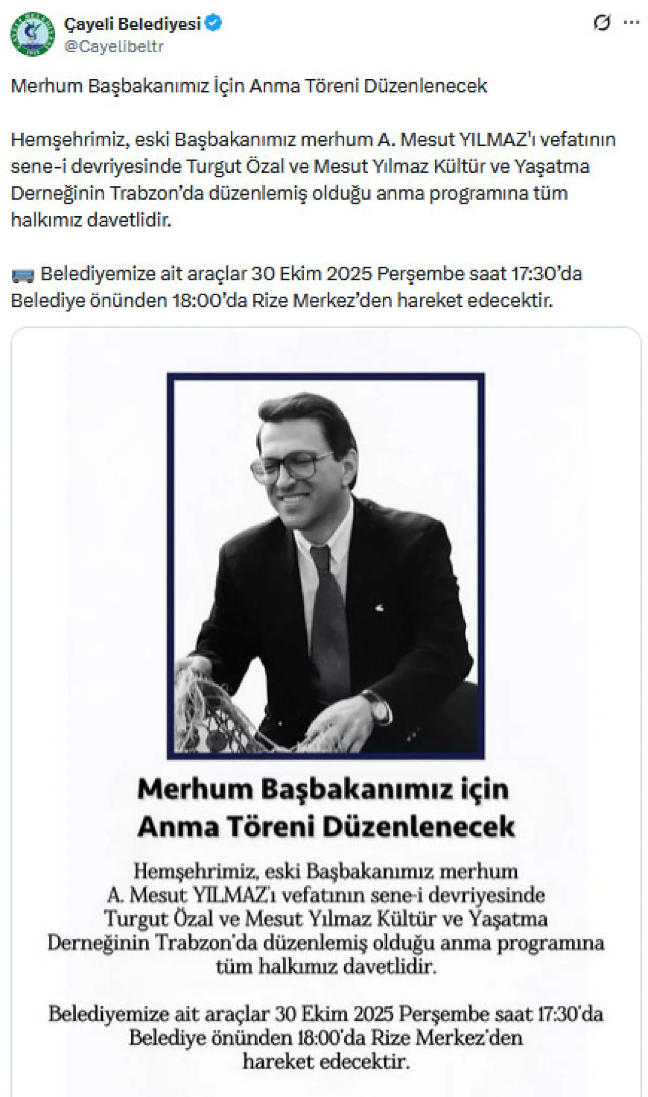 Çayeli Belediyesinden yapılan açıklamada, "Hemşehrimiz, eski Başbakanımız merhum A. Mesut Yılmaz'ı vefatının sene-i devriyesinde Turgut Özal ve Mesut Yılmaz Kültür ve Yaşatma Derneğinin Trabzon’da düzenlemiş olduğu anma programına tüm halkımız davetlidir. Belediyemize ait araçlar 30 Ekim 2025 Perşembe saat 17:30’da Belediye önünden, 18:00’da Rize Merkez’den hareket edecektir." ifadelerine yer verildi.