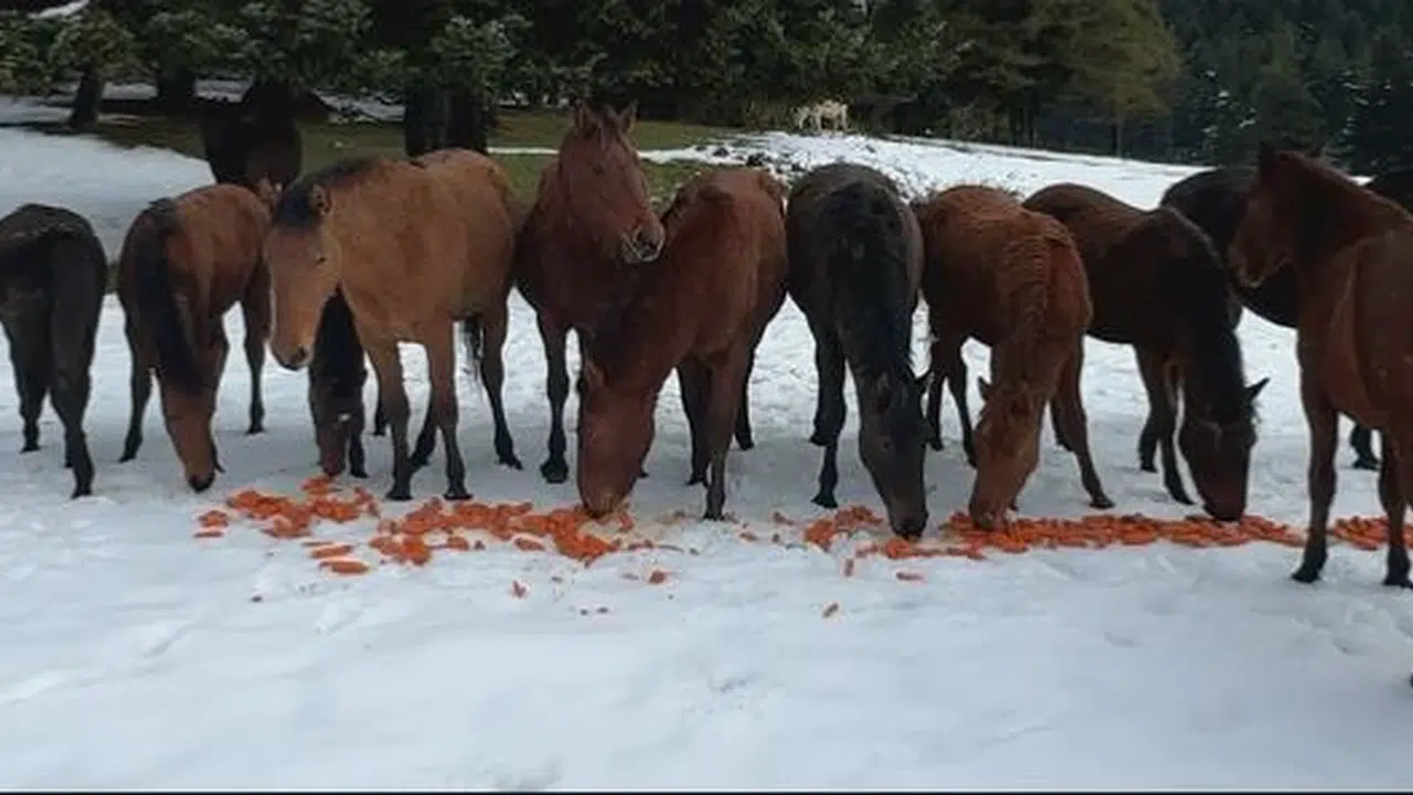 Oğuzhan EKE/BOLU,(DHA)- BOLU'da karla kaplanan At Yaylası'nda doğasever Gökhan Bilen, yiyecek bulmakta zorlanan yılkı atlarını havuçla besledi.