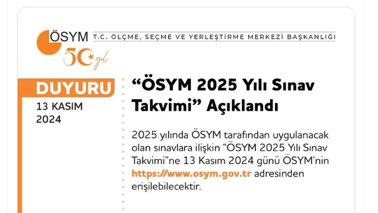 ÖSYM Başkanı Ersoy, sosyal medya hesabından yaptığı açıklamada, "ÖSYM 2025 yılı sınav takvimi belirlendi, hayırlı olsun. Sınavlara katılacak tüm adaylara başarılar diliyorum. YKS 21-22 Haziran tarihlerinde yapılacak. 2025-KPSS A Grubu (Genel Yetenek-Genel Kültür) uygulaması 7 Eylül'de, 2025-KPSS A Grubu Alan Bilgisi testleri ise 13-14 Eylül tarihlerinde gerçekleştirilecek" dedi. 2025 yılında ÖSYM tarafından uygulanacak olan sınavlara ilişkin takvim, 'https://www.osym.gov.tr' adresinde erişime açıldı. (DHA)