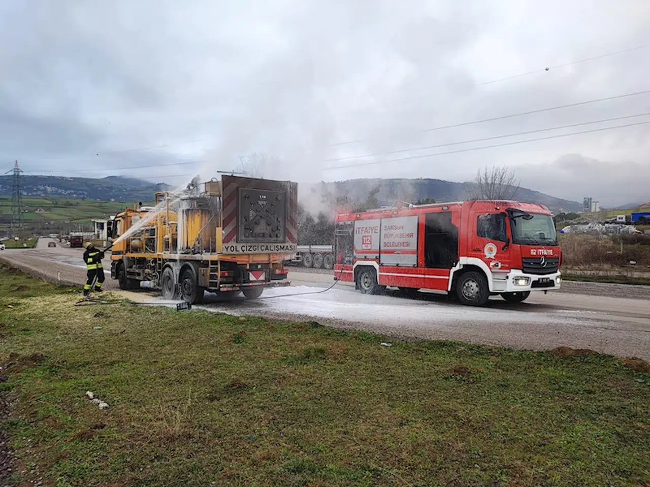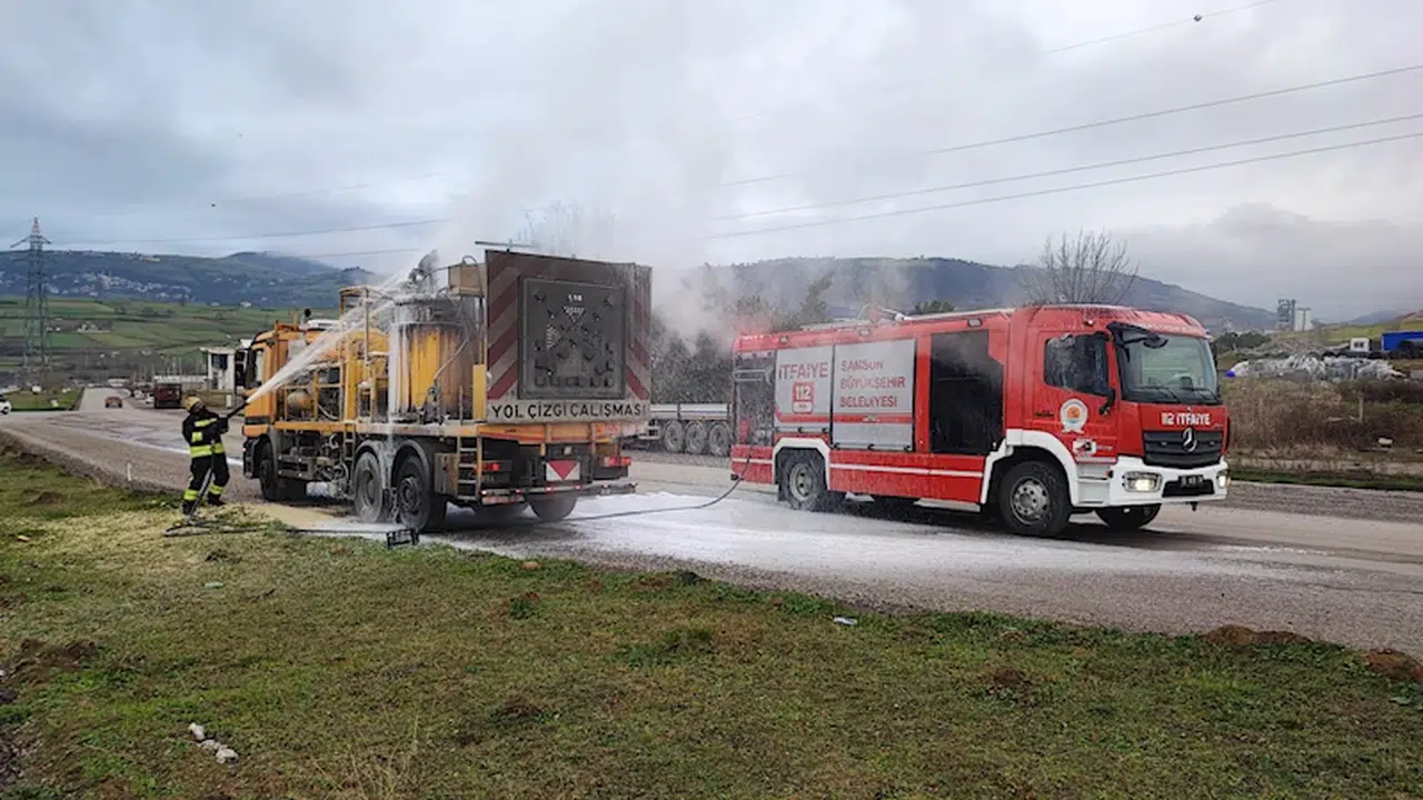 Emre ÖNCEL/SAMSUN, (DHA)- SAMSUN’un İlkadım ilçesinde Karayolları’na ait yol çizgisi çalışmalarında kullanılan kamyonda çıkan yangın, itfaiye ekipleri tarafından söndürüldü.