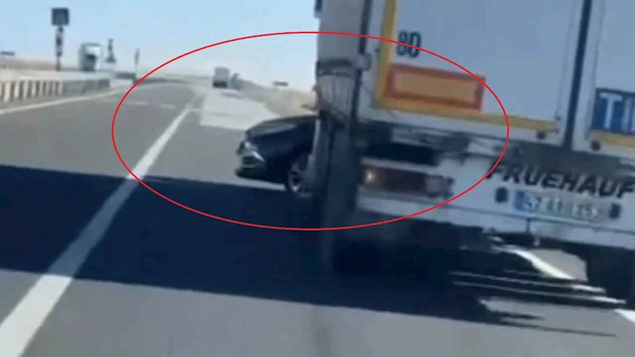Ahmet AKKUŞ/NUSAYBİN,(Mardin),(DHA)- MARDİN'in Nusaybin ilçesinde, seyir halindeki TIR'ın sürücüsü, kendisini geçmek isteyen otomobile yol vermek isterken, aracı önüne alıp sürükledi. Olayda yaralanan olmazken, o anlar cep telefonu kamerasıyla kaydedildi.