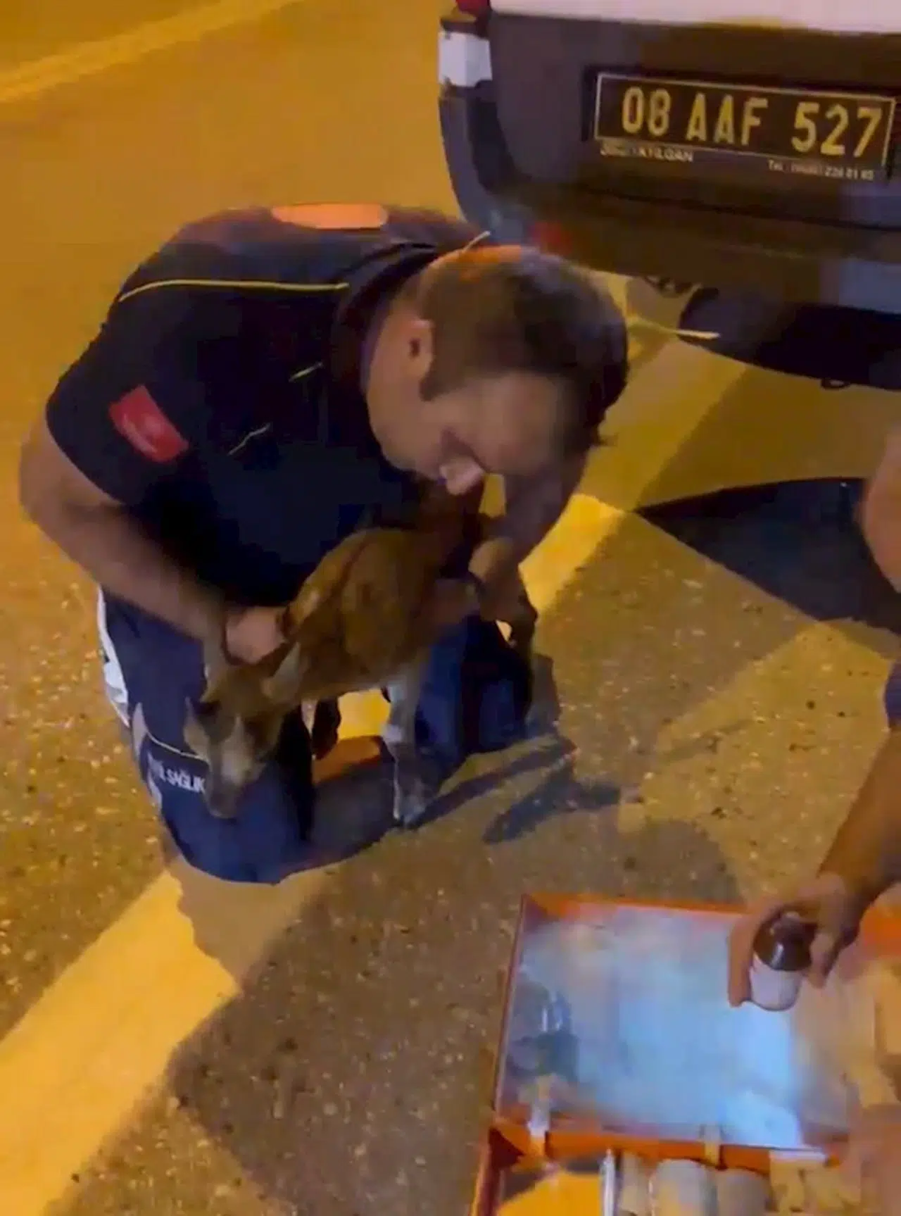 Artvin'den Yusufeli ilçesine seyreden ambulans içerisindeki sağlık personeli, yaralı bir oğlak fark etti. Ambulansı yol kenarına çekip, yaralı yavruyu muayene eden ekipler, başından yaralanan keçiyi tedavi edip, geri saldı. Kısa süre kara yolunda ilerleyen keçi yavrusu, ormana girerek kayboldu. Keçi yavrusunun sağlık personeli tarafından tedavi edilmesi, cep telefonu kamerasına yansıdı. Görüntülerde; sağlık personelinden birinin keçi yavrusunu kucağına aldığı, diğer sağlık personelinin pansuman yaptığı anlar yer aldı. (DHA)