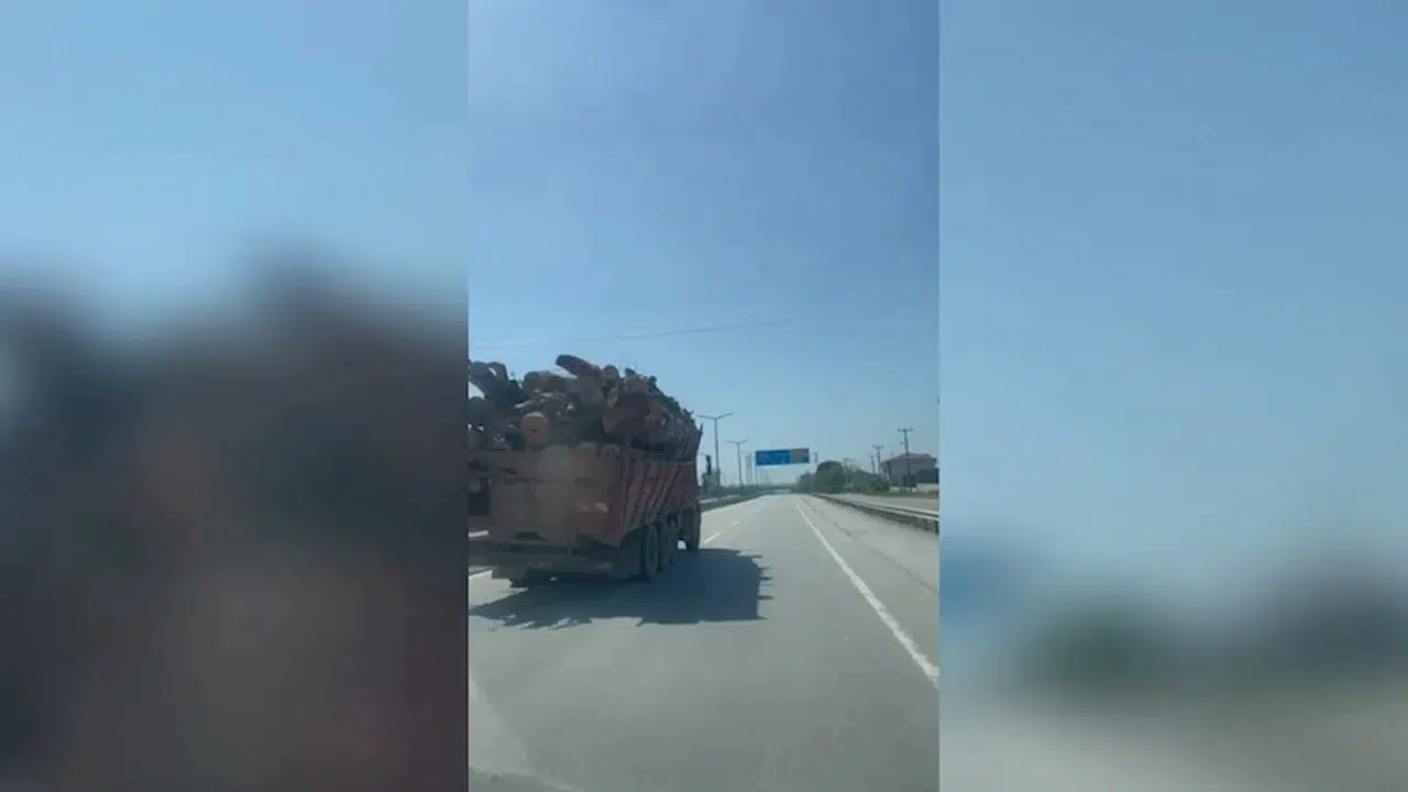 Olay, öğle saatlerinde, D-100 kara yolunda meydana geldi. Ankara istikametinde, düzensiz şekilde istiflendiği görülen tomrukların bulunduğu kamyon, sürücüleri tedirgin etti. Sürücüler, kamyonun trafikte tehlikeye neden olduğunu ifade etti. Aynı istikamete seyreden başka araçtaki kişilerin cep telefonu kamerasıyla kaydettiği görüntülerde aracın kasasındaki ağaçların uygunsuz istiflenme ve aşırı yük sebebiyle hafif yan kaydığı da görüldü. Görüntüyü kaydeden kişi, "Gördüğünüz gibi D-100 kara yolunda yaklaşık yüz kilometre hızla giden bir kamyon. Bu nasıl bir yüklemedir" diye konuştu. (DHA)