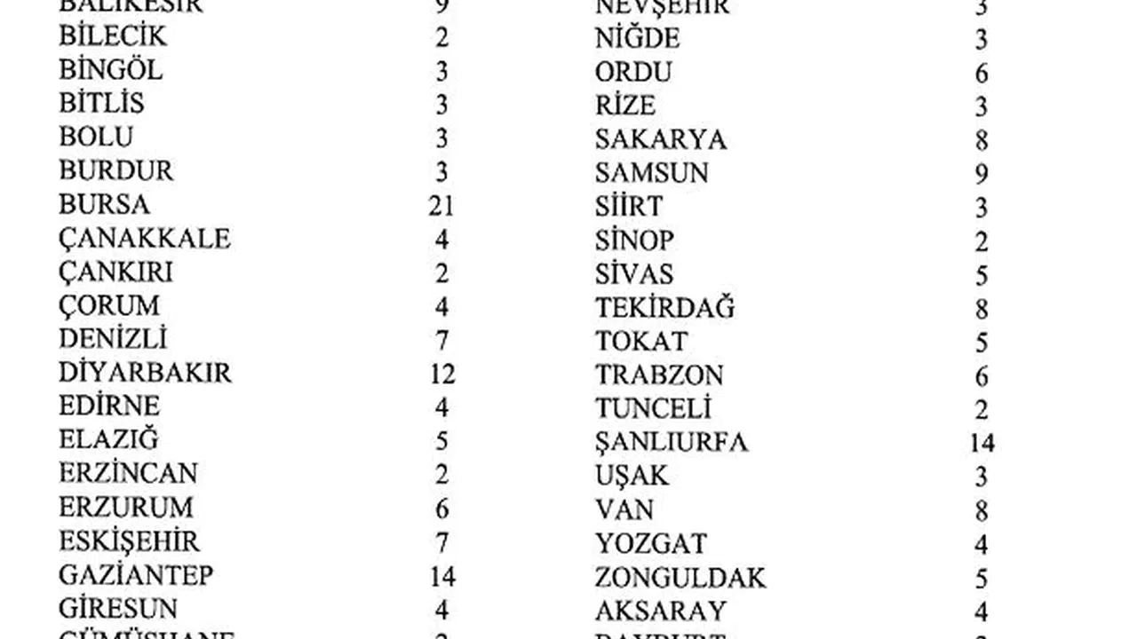 "Adana 15, Adıyaman 5, Afyonkarahisar 6, Ağrı 4, Amasya 3, Ankara 36, Antalya 17, Artvin 2, Aydın 8, Balıkesir 9, Bilecik 2, Bingöl 3, Bitlis 3, Bolu 3, Burdur 3, Bursa 21, Çanakkale 4, Çankırı 2, Çorum 4, Denizli 7, Diyarbakır 12, Edirne 4, Elazığ 5, Erzincan 2, Erzurum 6, Eskişehir 7, Gaziantep 14, Giresun 4, Gümüşhane 2, Hakkari 3, Hatay 10, Isparta 4, Mersin 13, İstanbul 96, İzmir 28, Kars 3, Kastamonu 3, Kayseri 10, Kırklareli 3, Kırşehir 2, Kocaeli 14, Konya 15, Kütahya 4, Malatya 6, Manisa 10, Kahramanmaraş 8, Mardin 6, Muğla 7, Muş 3, Nevşehir 3, Niğde 3, Ordu 6, Rize 3, Sakarya 8, Samsun 9, Siirt 3, Sinop 2, Sivas 5, Tekirdağ 8, Tokat 5, Trabzon 6, Tunceli 2, Şanlıurfa 14, Uşak 3, Van 8, Yozgat 4, Zonguldak 5, Aksaray 4, Bayburt 2, Karaman 3, Kırıkkale 3, Batman 5, Şırnak 4, Bartın 2, Ardahan 2, Iğdır 2, Yalova 3, Karabük 3, Kilis 2, Osmaniye 4, Düzce 3." (DHA)