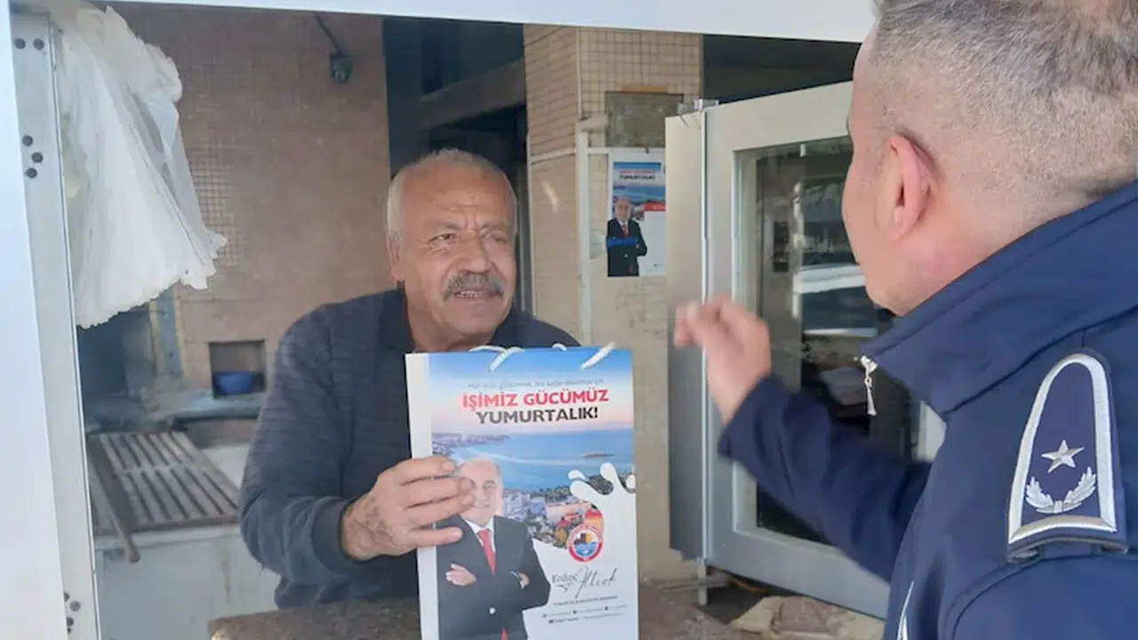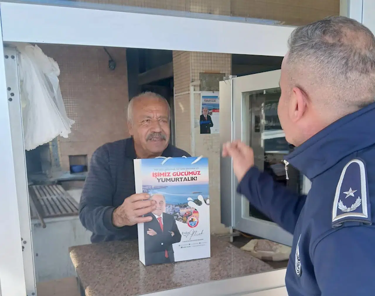 İlçedeki iş yerlerinde denetim yapan Zabıta Müdürlüğü ekipleri, vatandaşlara çanta içerisinde takvim, kalem ve çeşitli eşantiyon ürünleri de hediye etti. Vatandaşlar da ekiplere teşekkür etti.
