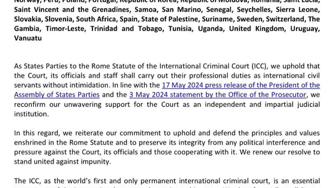 “Mahkeme'nin, yetkililerinin ve personelinin uluslararası kamu görevlileri olarak mesleki görevlerini baskı uygulanmadan yerine getirmelerini destekliyoruz. Bağımsız ve tarafsız bir yargı kurumu olarak Mahkeme'ye olan sarsılmaz desteğimizi teyit ediyoruz.