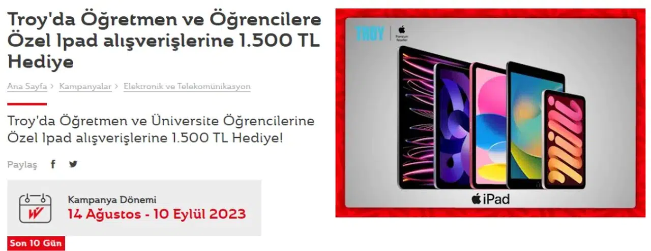 Kampanyadan yararlanmak için, kampanyaya dahil olan Troy'da Öğretmen ve Öğrencilere Özel iPad alışverişlerine 1.500 TL Hediye ve Troy'da Öğretmen ve Öğrencilere Özel Mac alışverişlerine 2.500 TL Hediye kampanya sayfasından "Katıl" butonuna tıklamak veya SMS ile "IPAD" yazıp 4757'ye göndermek gerekiyor.
