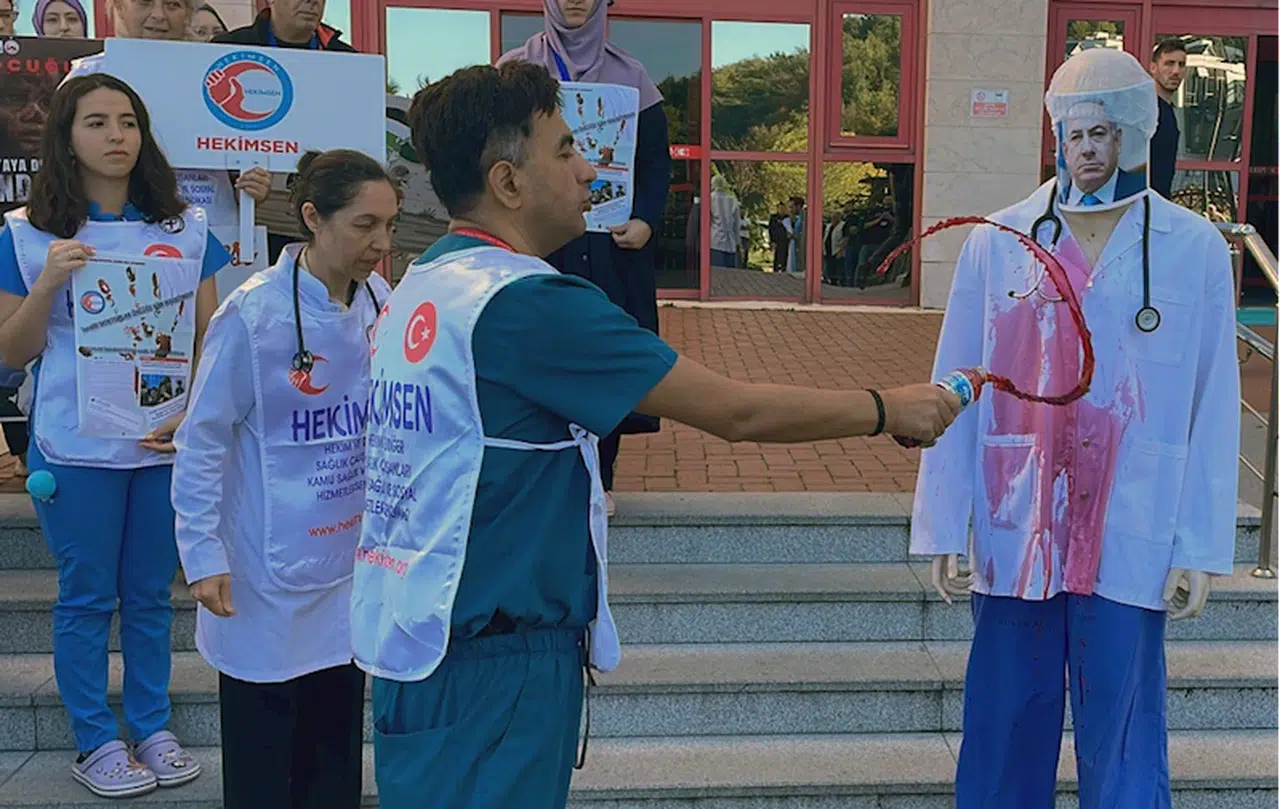 Açıklama sonrası doktor önlüğü giydirilen mankene İsrail Başbakanı Binyamin Netanyahu'nun fotoğrafını asan doktorlar, temsilen beyaz önlüğe vişne suyu döktü, mankenin üzerine hekimlik andı asıldı.