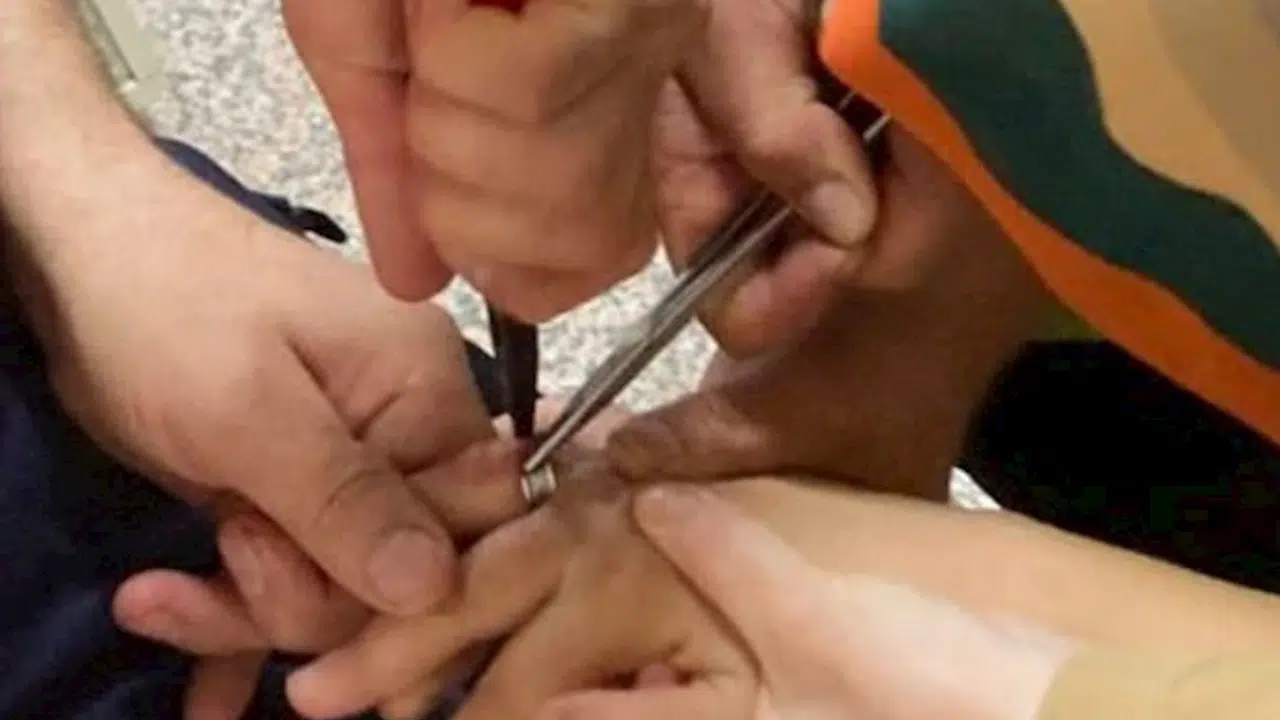 Ayan'ın parmağındaki yüzük, sağlık personelinin çabasına rağmen çıkarılamayınca itfaiye ekiplerinden yardım istendi.