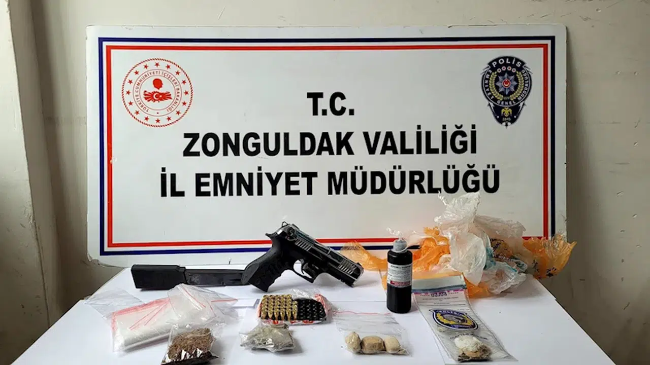 Zonguldak Emniyet Müdürlüğü Narkotik Suçlarla Mücadele Şube Müdürlüğü ekipleri, Ereğli ve Alaplı ilçelerinde belirlenen adreslere uyuşturucu operasyonu düzenledi. Operasyonda, şüphelilerin ev ve araçlarında yapılan aramalarda, 112 gram sentetik kannabinoid, 83 adet extacy hap, 50 gram metamfetamin, 47 gram kokain, uyuşturucu madde yapımında kullanılan 70 ml sentetik sıvı, 2 adet kurusıkı tabanca ve 28 adet kurusıkı mermisi ele geçirildi. Olayla ilgili gözaltına 7 şüpheliden, F.A., T.Ü., S.Y., İ.G. ve S.Y. emniyetteki işlemlerinin ardından sevk edildiği mahkeme tarafından tutuklandı. (DHA)