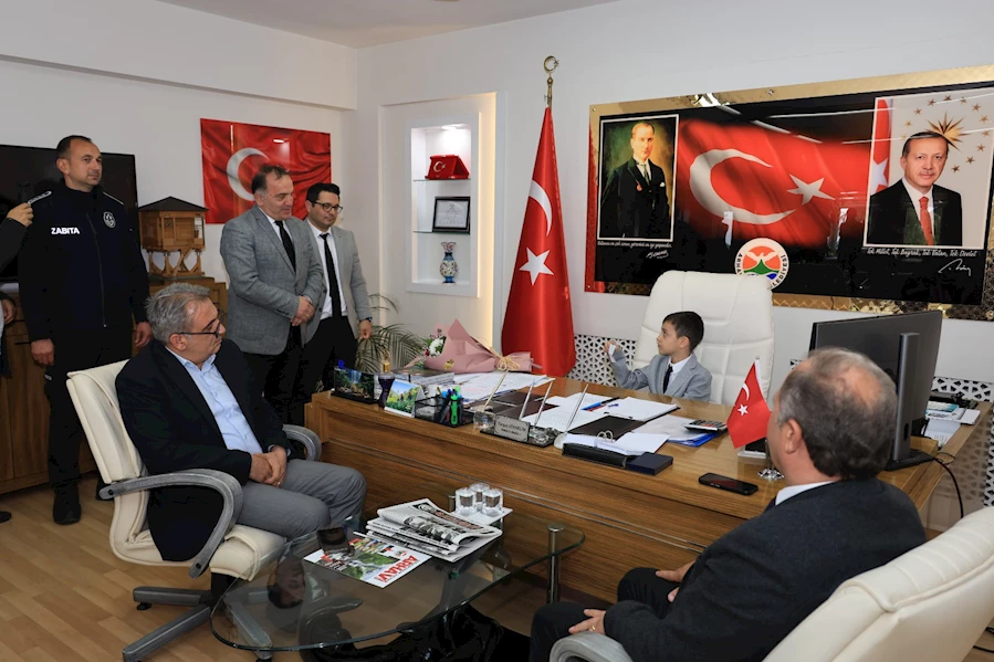 Başkan Turgay Ataselim’in makamında gerçekleşen törende, küçük başkana arkadaşları Çakır Gezen, Ayaz Özdemir ve Yağmur Ada Güney eşlik etti. Okul müdürleri gözetiminde gerçekleştirilen ziyarette Mahfuz Kazmaoğlu, belediyenin birim amirlerinden bilgi alarak başkanlık görevini büyük bir ciddiyetle üstlendi.