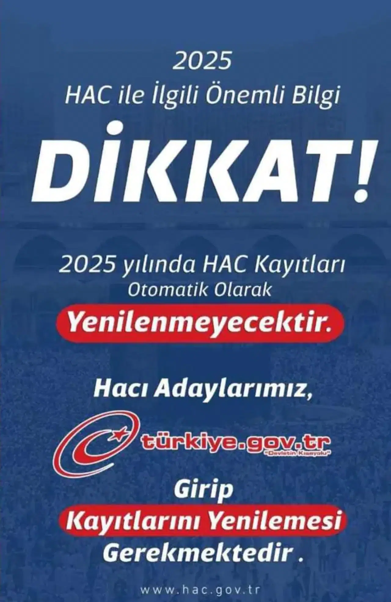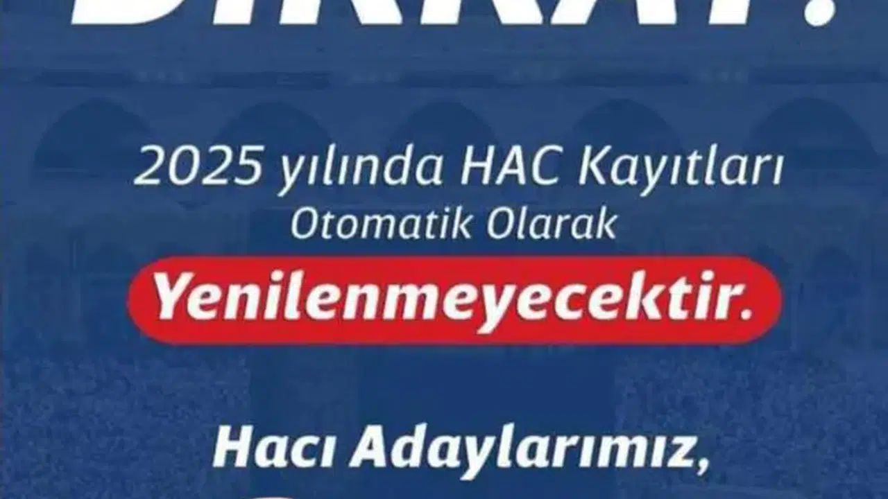 Akçaabat İlçe Müftülüğü, 2024 yılı haccı için çekilen kuraya katıldığı halde kesin kayıt sırası gelmeyen veya çeşitli sebeplerle hacca gidemeyen vatandaşların dikkatine sunulan önemli bir bilgilendirme yaptı. 2025 yılı için hac ön kayıtları ve kayıt yenileme işlemleri hakkında yapılan açıklamada, kayıtların otomatik olarak güncellenmeyeceği belirtildi.