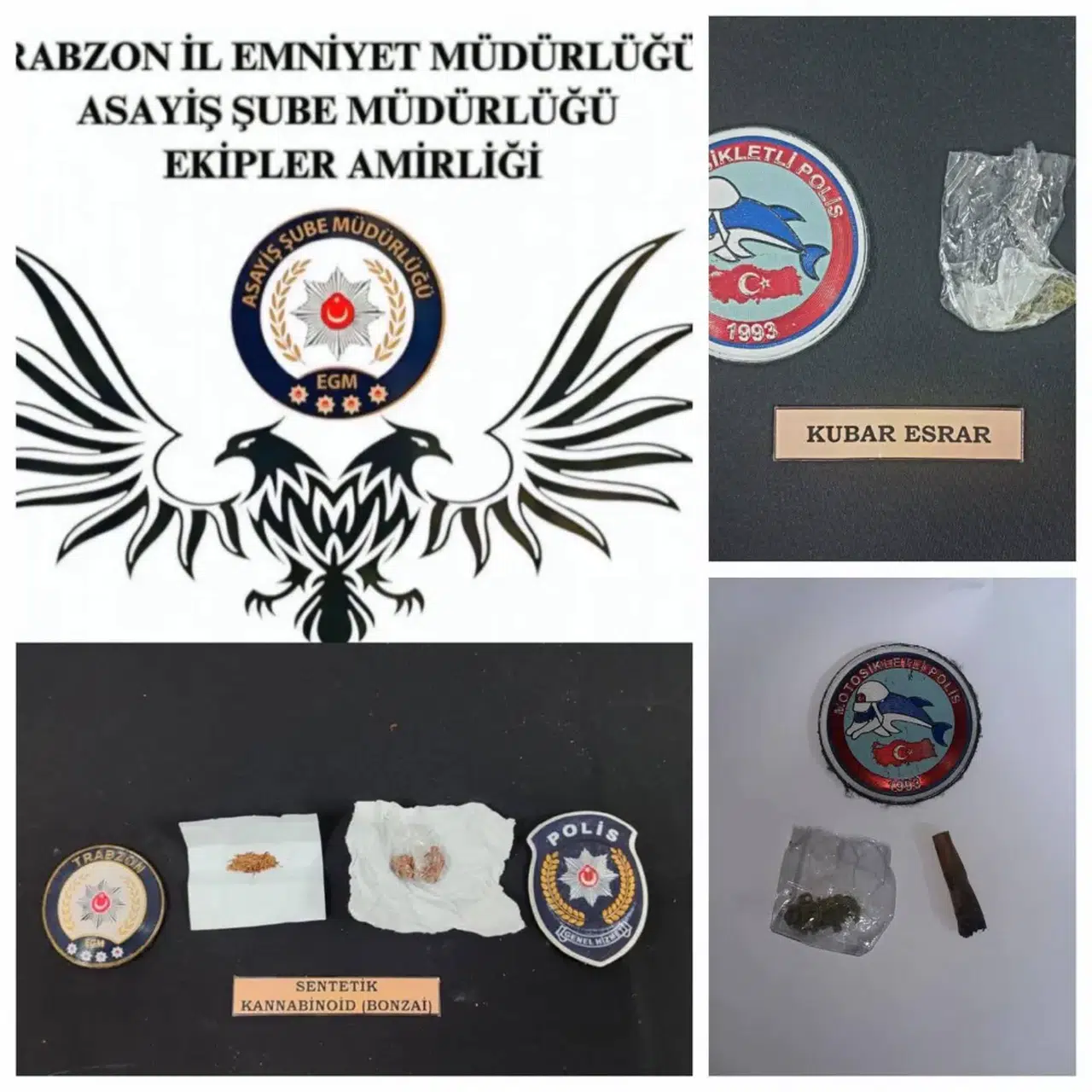 Narkotik Suçlarla Mücadele ekiplerinin düzenlediği operasyonlarda, 1 kilo 200 gram sentetik kannabinoid (bonzai), bir miktar esrar, metamfetamin, 8 adet sentetik ecza hapı, 70 adet ecstasy hapı, uyuşturucu kullanımında kullanılan 2 adet cam düzenek (payp), uyuşturucu üretiminde kullanılan aseton ve paketlemede kullanılan alüminyum folyo ele geçirildi. Operasyonlar neticesinde 10 şüpheli hakkında adli soruşturma başlatıldı.