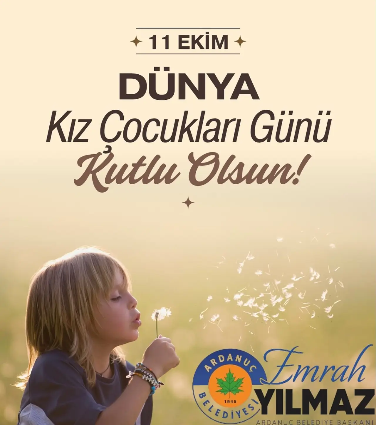 Ardanuç Belediyesi, 11 Ekim Dünya Kız Çocukları Günü’nü ilçede sosyal medya üzerinden paylaşılan anlamlı mesajlarla kutladı. Belediye Başkanı Emrah Yılmaz, sosyal medya hesabından yaptığı paylaşımda, “Geleceğe umutla bakmamızı sağlayan kız çocuklarımızın Dünya Kız Çocukları Günü kutlu olsun!” ifadelerine yer verdi.