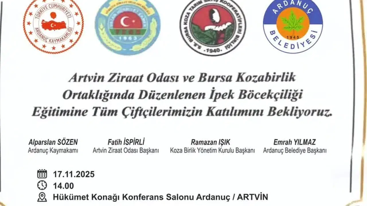 Ardanuç Belediye Başkanlığı, Artvin Ziraat Odası ve Bursa Kozabirlik iş birliğiyle 17 Kasım 2025'te ipek böcekçiliği eğitimi düzenleyecek. Eğitim, çiftçilerin üretim kapasitesini artırmayı ve alternatif gelir kaynakları oluşturmayı hedefliyor. Tüm çiftçiler davetli.