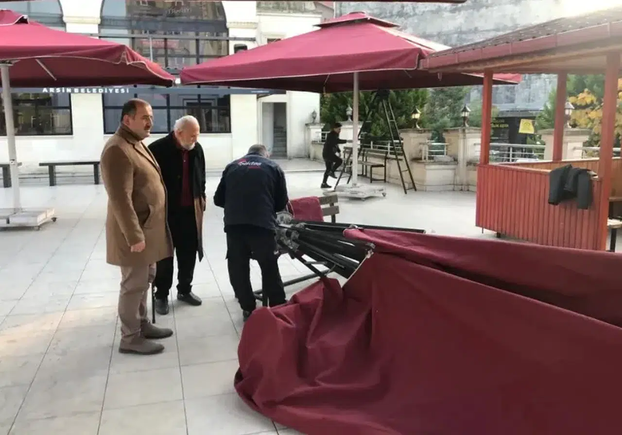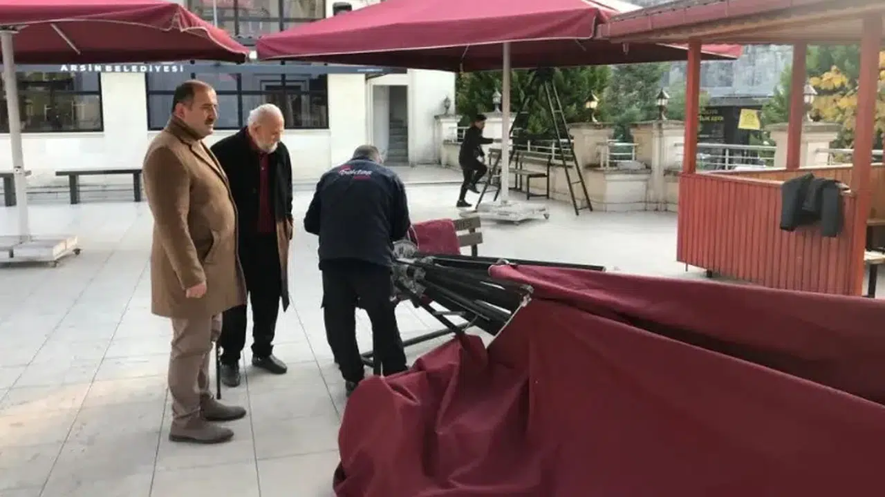 Arsin Belediyesi, şiddetli rüzgarlarda hasar gören Arsin Merkez Ulu Camii'nin avlusunda bulunan Büyük Tente Şemsiyelerin bakım, onarım ve tamirat çalışmalarını sürdürüyor.