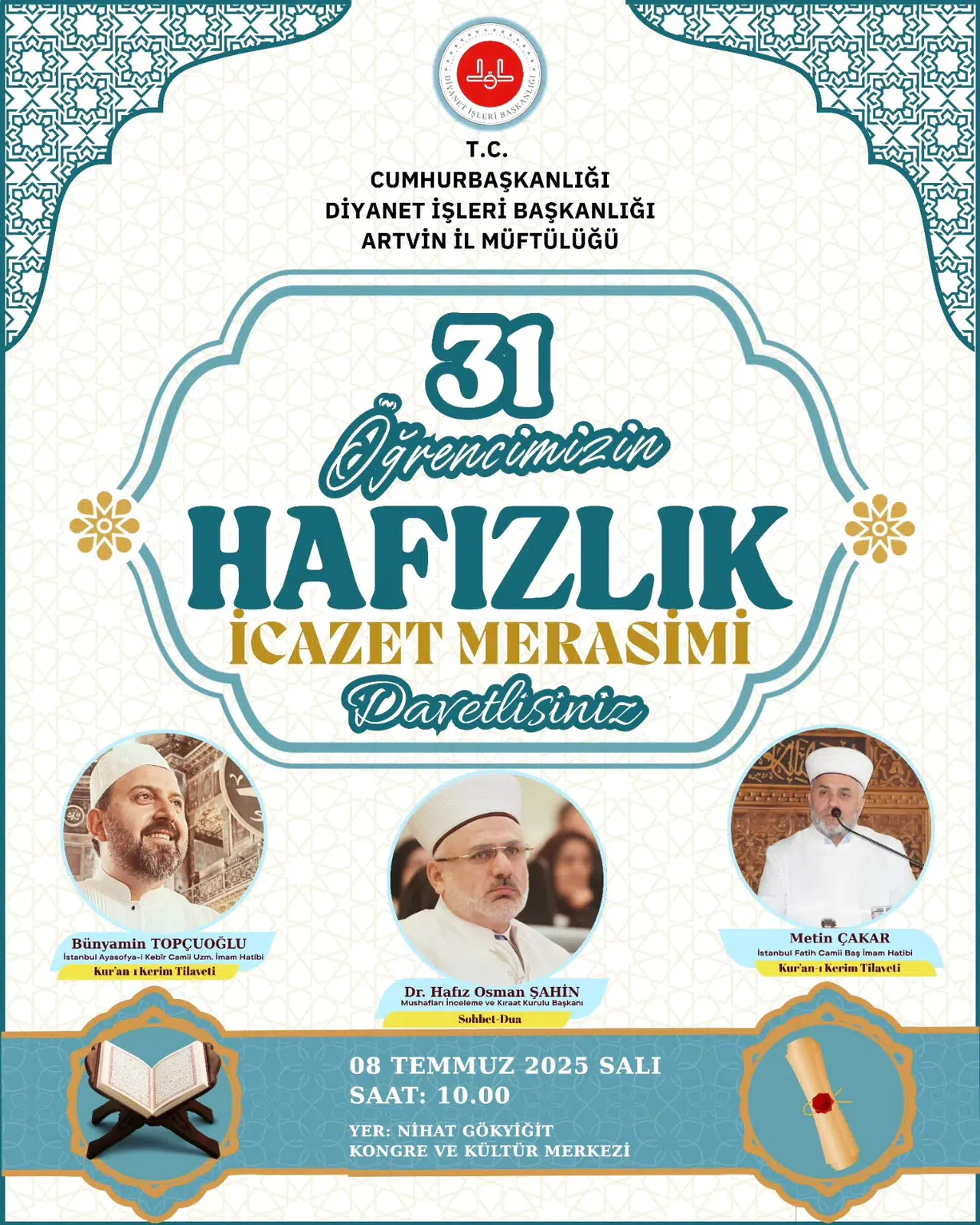 Artvin Merkez Hafızlık Kur’an Kurslarında eğitimlerini başarıyla tamamlayan 31 hafız, A.Ç.Ü. Nihat Gökyiğit Kongre ve Kültür Merkezi’nde düzenlenecek törende icazet belgelerini alacak. Saat 10.00’da başlayacak programda, hafızlar dualarla ve Kur’an tilavetleriyle taçlandırılacak.