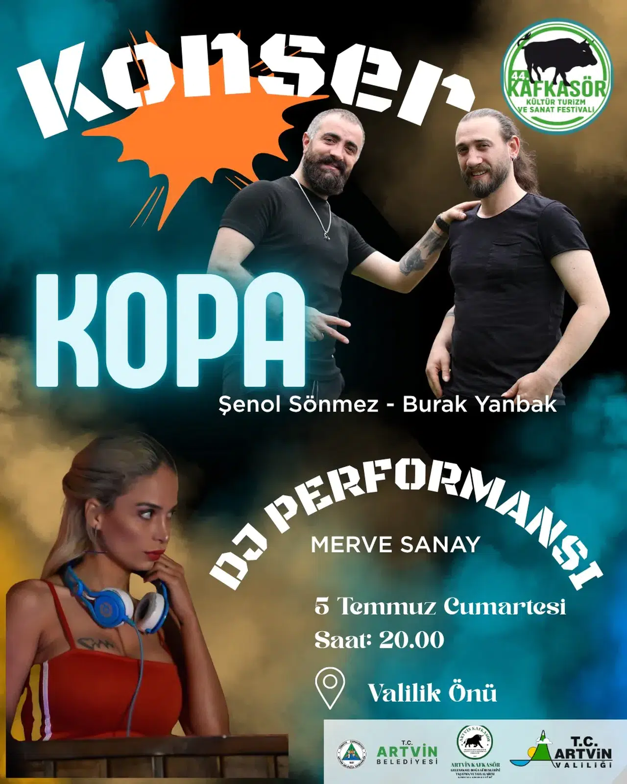 Artvin’de düzenlenen 44. Kafkasör Kültür, Turizm ve Sanat Festivali, müzik dolu bir geceye ev sahipliği yapacak. 5 Temmuz Cumartesi günü saat 20.00’de Valilik önünde gerçekleşecek konserde, KOPA grubu ve DJ Merve Sanay sahne alacak.