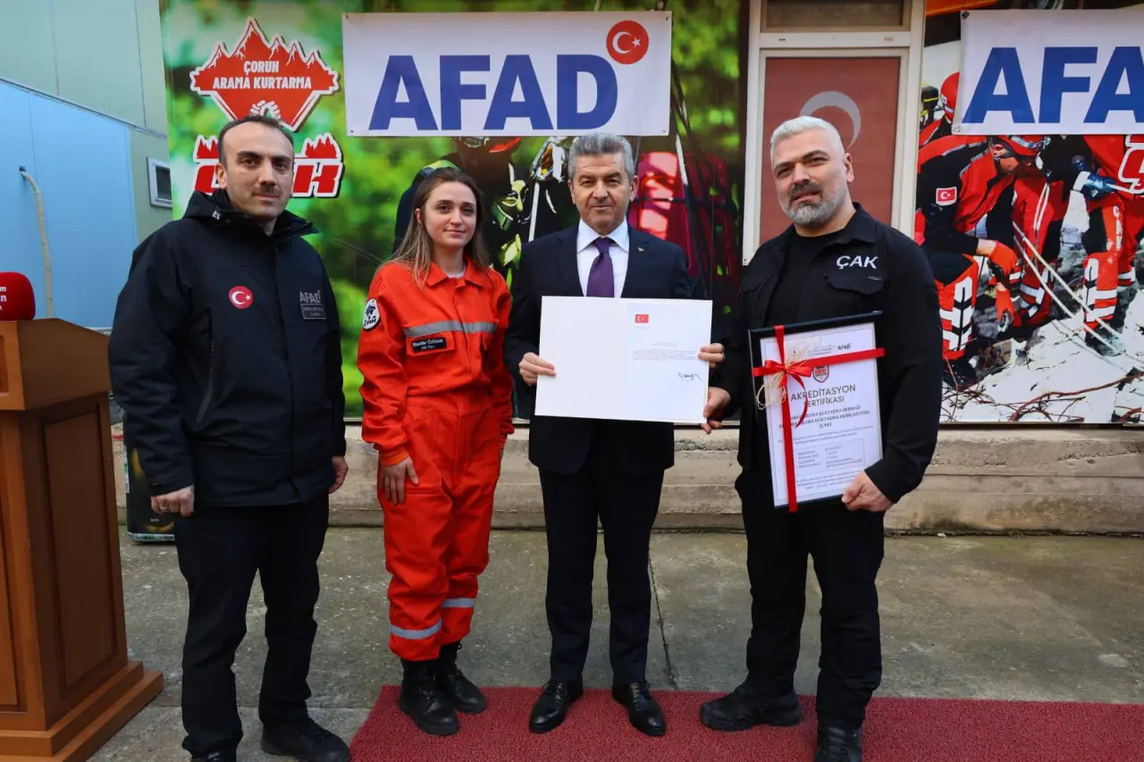 Artvin Valiliği ev sahipliğinde gerçekleştirilen programda, AFAD koordinasyonunda yürütülen akreditasyon sürecini başarıyla tamamlayan Çoruh Arama Kurtarma (ÇAK) ekibi için sertifika ve bröve töreni düzenlendi.