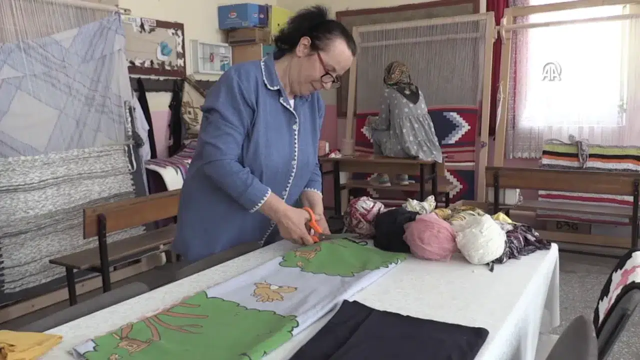 Eskiyen örgü ürünlerin sökülmesiyle elde edilen ip ve kullanılmayan kıyafetlerden kesilen kumaş parçalarından geleneksel tezgahlarda usta öğretici gözetiminde kilim dokuyan kursiyerler, hem atık ürünleri ekonomiye kazandırıyor hem de meslek öğreniyor.