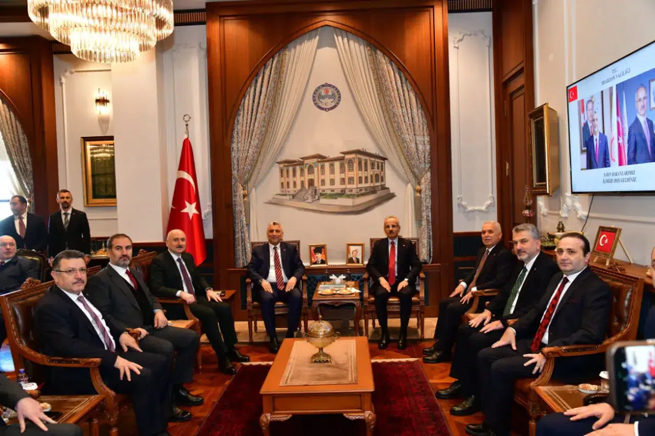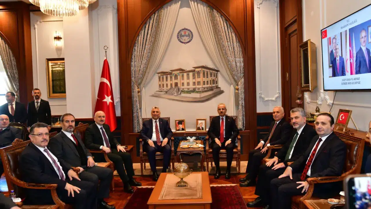 Ulaştırma ve Altyapı Bakanı Abdulkadir Uraloğlu ve Ticaret Bakanı Ömer Bolat, Trabzon’daki çeşitli programları kapsamında Trabzon Valiliğini ziyaret etti. Ziyaretlerine, Bakan Yardımcıları, Türkiye İhracatçılar Meclisi Başkanı Mustafa Gültepe, AK Parti Milletvekilleri Mustafa Şen ve Adil Karaismailoğlu, Büyükşehir Belediye Başkanı Ahmet Metin Genç ve diğer yetkililer eşlik etti. Trabzon Valisi Aziz Yıldırım tarafından Valilik önünde karşılanan Bakan Uraloğlu ve Bakan Bolat, Şeref Defteri’ni imzaladıktan sonra, Vali Yıldırım ile makamda bir araya gelerek ildeki güncel projeler hakkında bilgi alışverişinde bulundular. Bakanlar, Trabzon’un altyapı ve ticaret alanındaki mevcut projelerini değerlendirerek, ilerleyen süreçte yapılacak yatırımların şehir için büyük önem taşıdığını ifade ettiler.