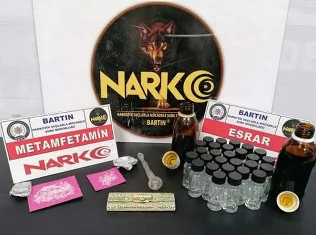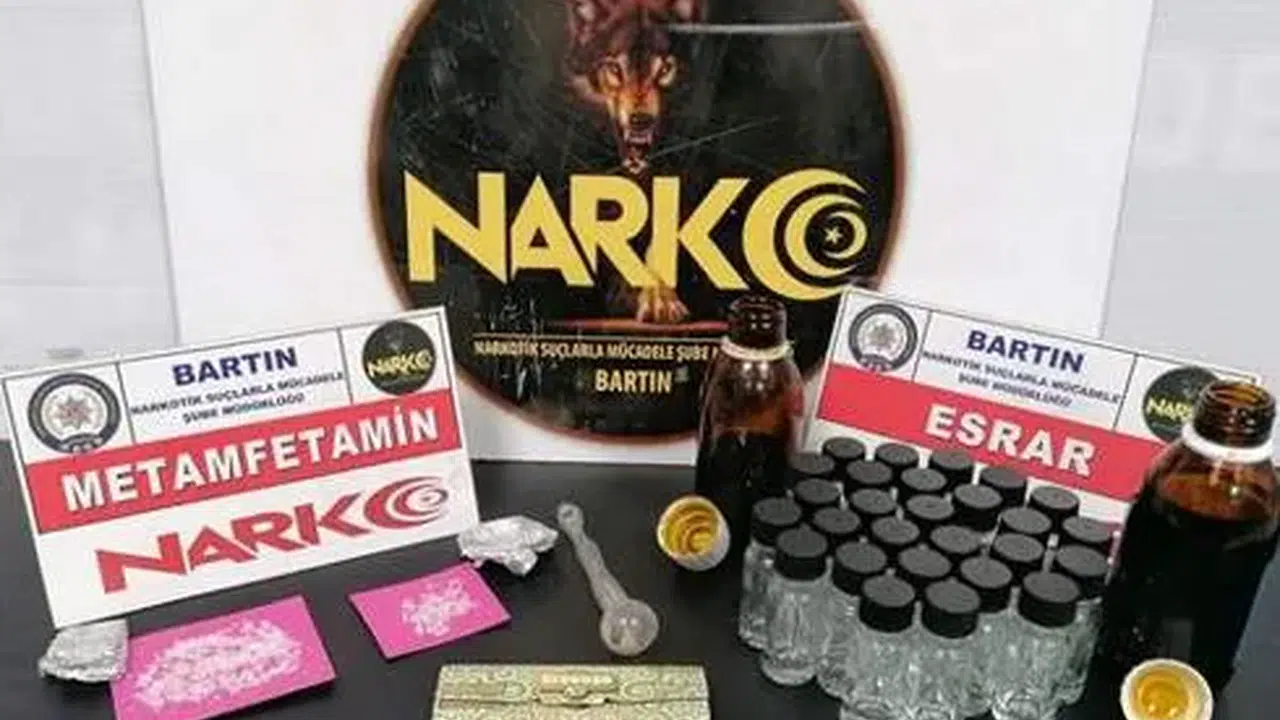Şahsın üzerinde ve eşyalarında yapılan aramada, iki parça halinde 3,78 gram metamfetamin, şurup şişesine saklanmış 483,46 gram esrar ve uyuşturucu kullanma aparatı (payp) ele geçirildi.