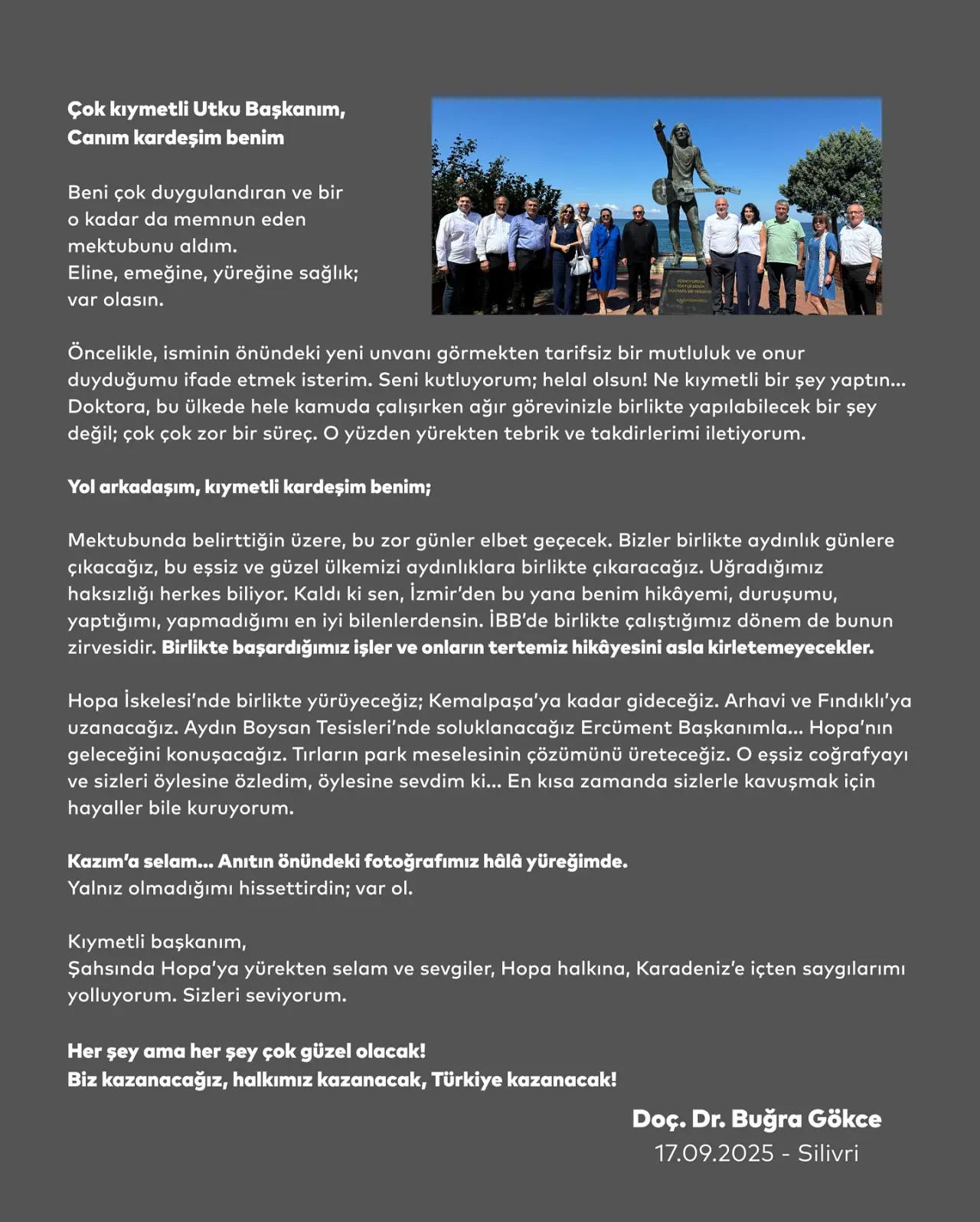 Öte yandan, Silivri Belediye Başkanı Buğra Gökce’nin gönderdiği mektup, hem Başkan Cihan’a hem de Hopa Belediyesi çalışanlarına moral kaynağı oldu. Başkan Cihan, mektuptaki güçlü ve yol gösterici sözlerle belediye çalışmalarında motivasyonu artırırken, vatandaşlara da umut ve güven mesajı verdi.