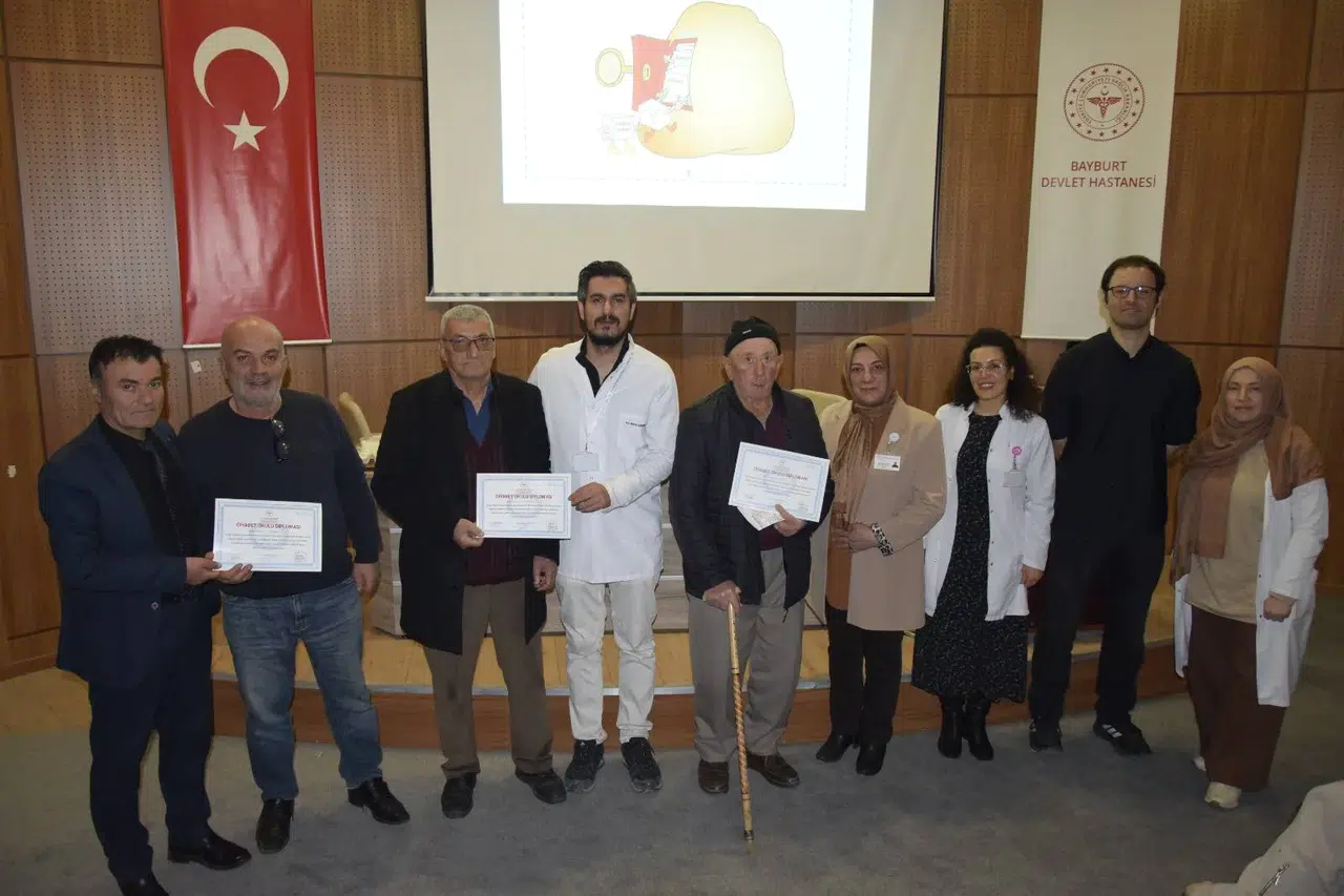 Bayburt Devlet Hastanesi bünyesinde yürütülen Diyabet Okulu eğitim programı, hasta ve hasta yakınlarının yoğun ilgi ve katılımıyla tamamlandı. Diyabetle yaşam konusunda farkındalık oluşturmayı amaçlayan eğitimlerde, katılımcılara hastalığın yönetimi, sağlıklı beslenme, ilaç kullanımı ve yaşam tarzı düzenlemeleri hakkında kapsamlı bilgiler aktarıldı.