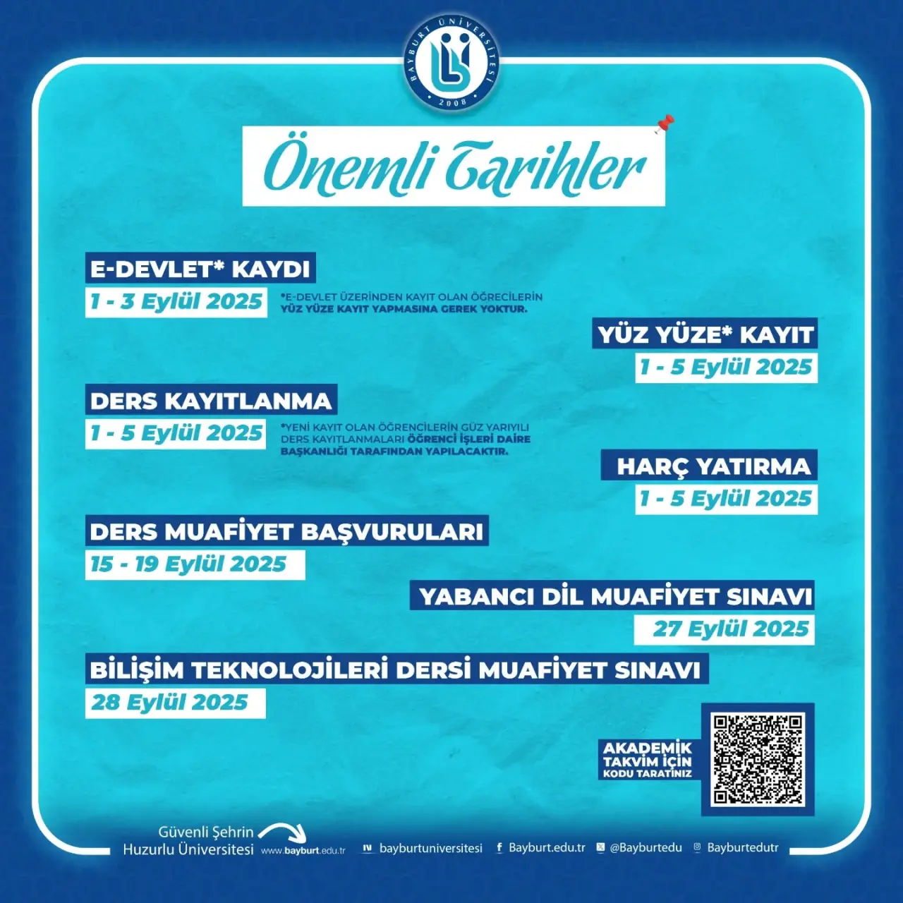 Bayburt Üniversitesi, yeni akademik yıl öncesinde öğrencilerini bilgilendirerek kayıt sürecini sorunsuz bir şekilde yürütmeyi hedefliyor. Üniversite yönetimi, öğrencilere yeni eğitim yılı için başarılar dilerken, kayıt sürecinde dijital ve yüz yüze imkânlar sunmaya devam edeceklerini belirtti.
