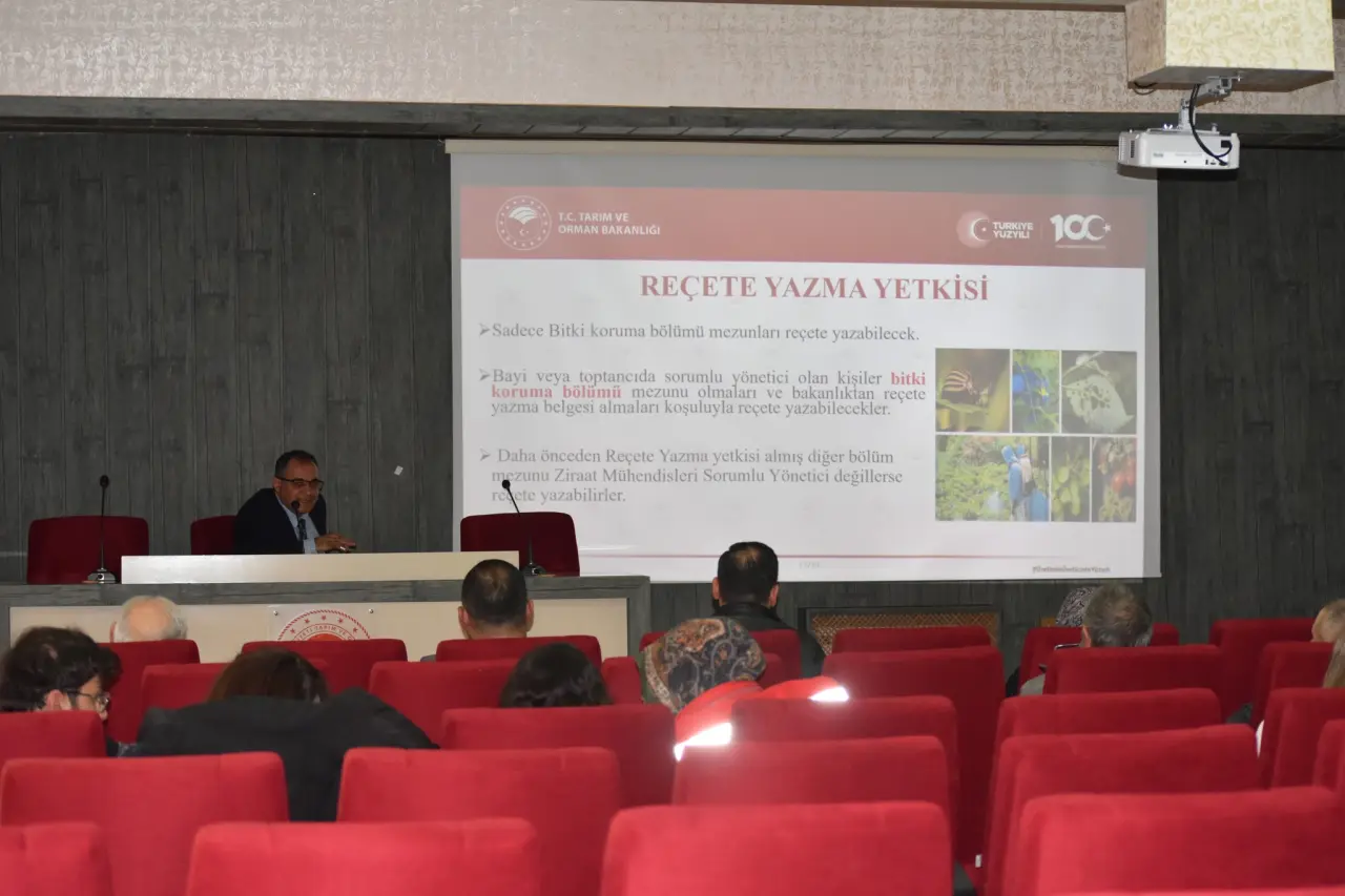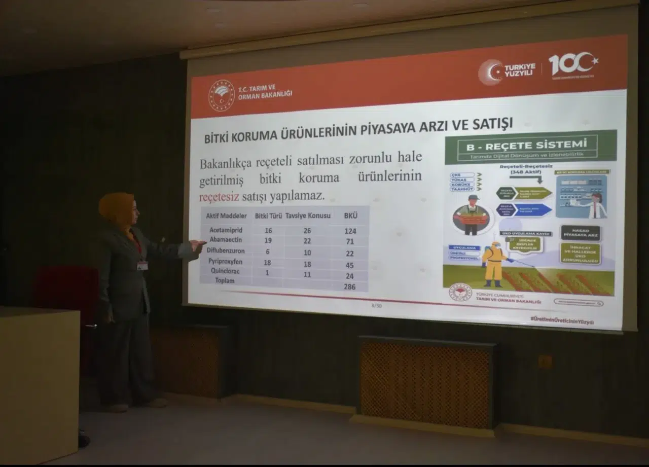 Bitkisel Üretim ve Bitki Sağlığı Şube Müdürü Muammer Araz ile Ziraat Yüksek Mühendisi Meral Gedik Çiftçi tarafından verilen toplantıda, üreticilere sistemin işleyişi ve sağlayacağı avantajlar hakkında detaylı bilgiler aktarıldı. Özellikle bitki koruma ürünlerinin bilinçli kullanımı ve kayıt altına alınmasının önemi vurgulandı.