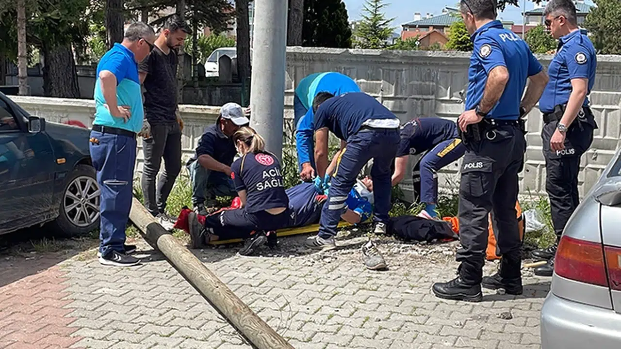 Sağlık Mahallesi 1449. Sokak'ta bulunan ağaç telefon direği, Mehmet K'nin (36) kabloda bakım yaptığı sırada kırılarak devrildi.
