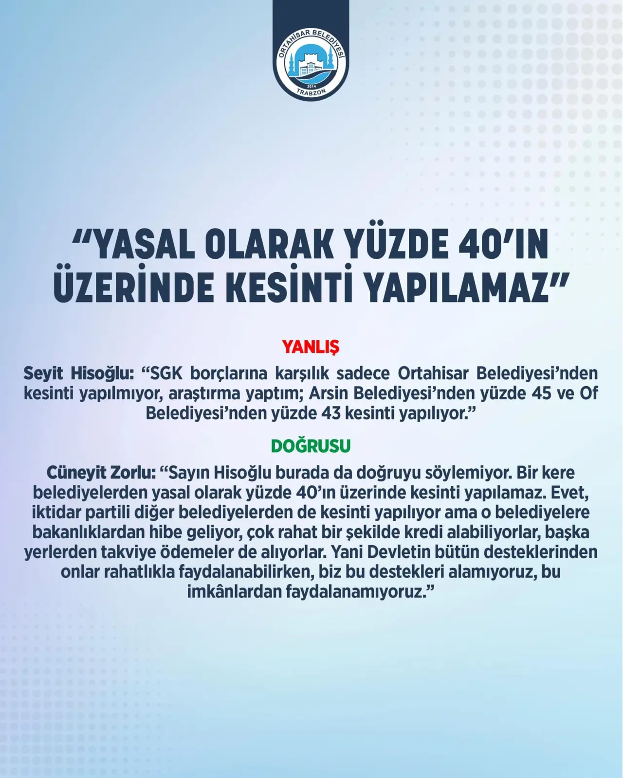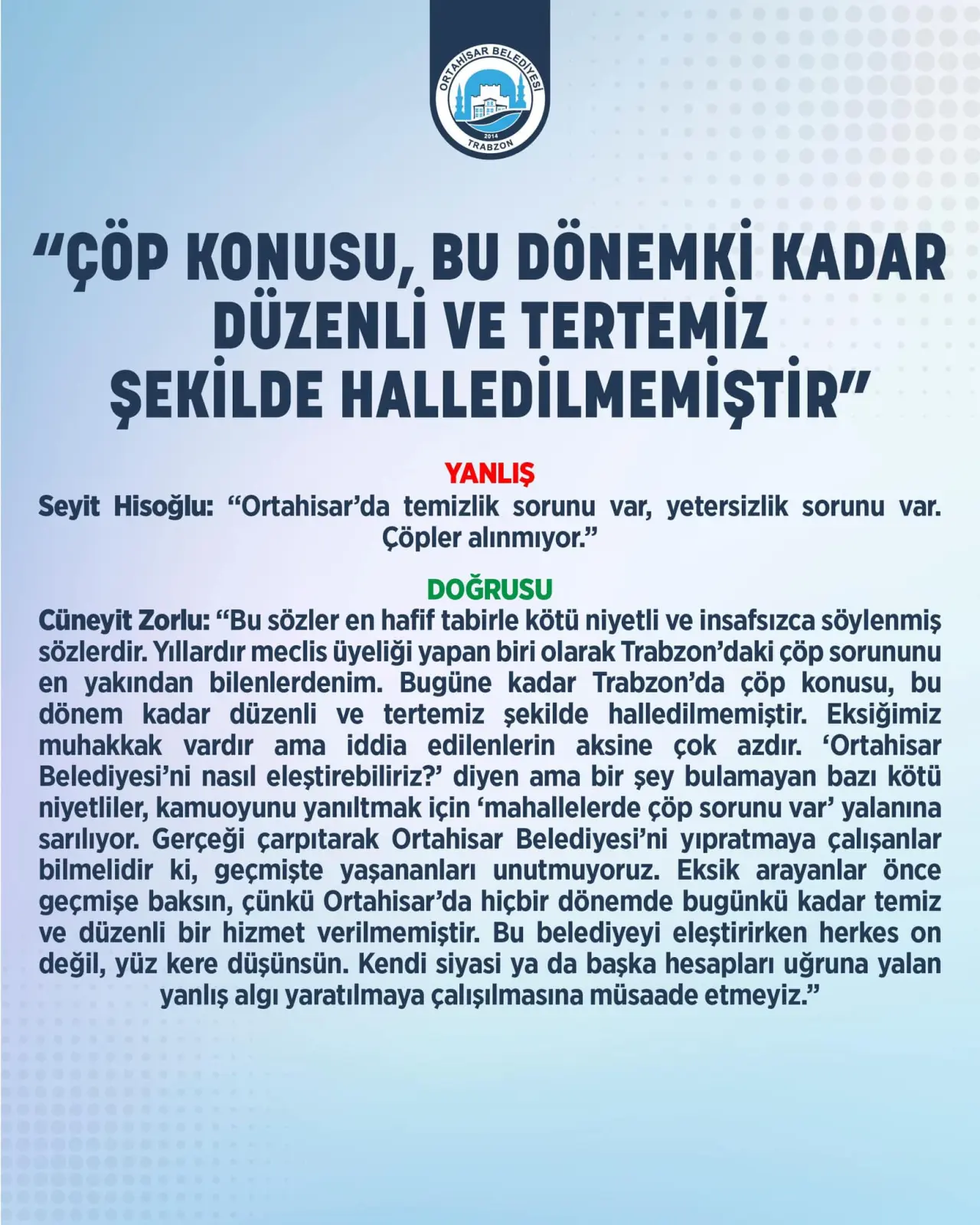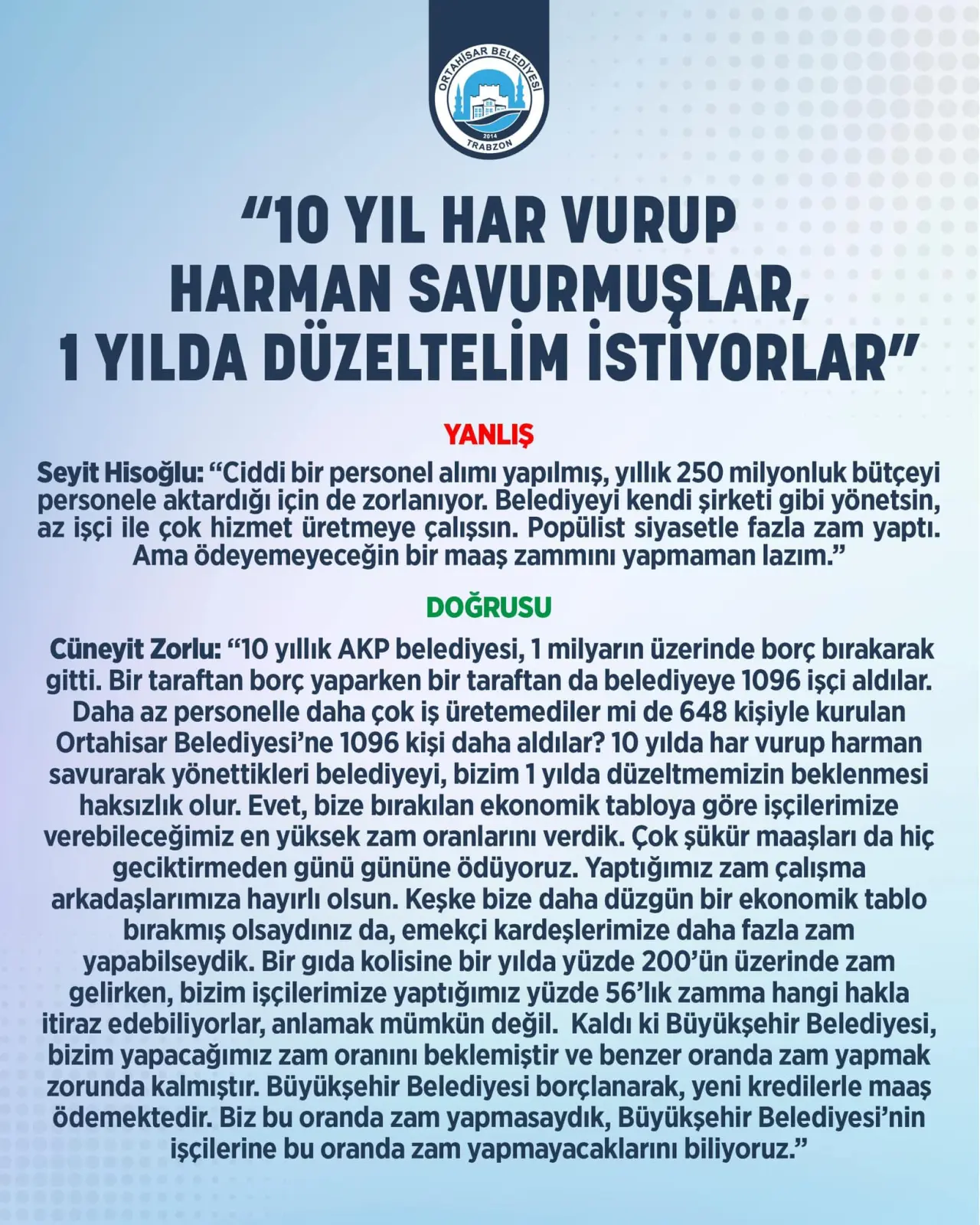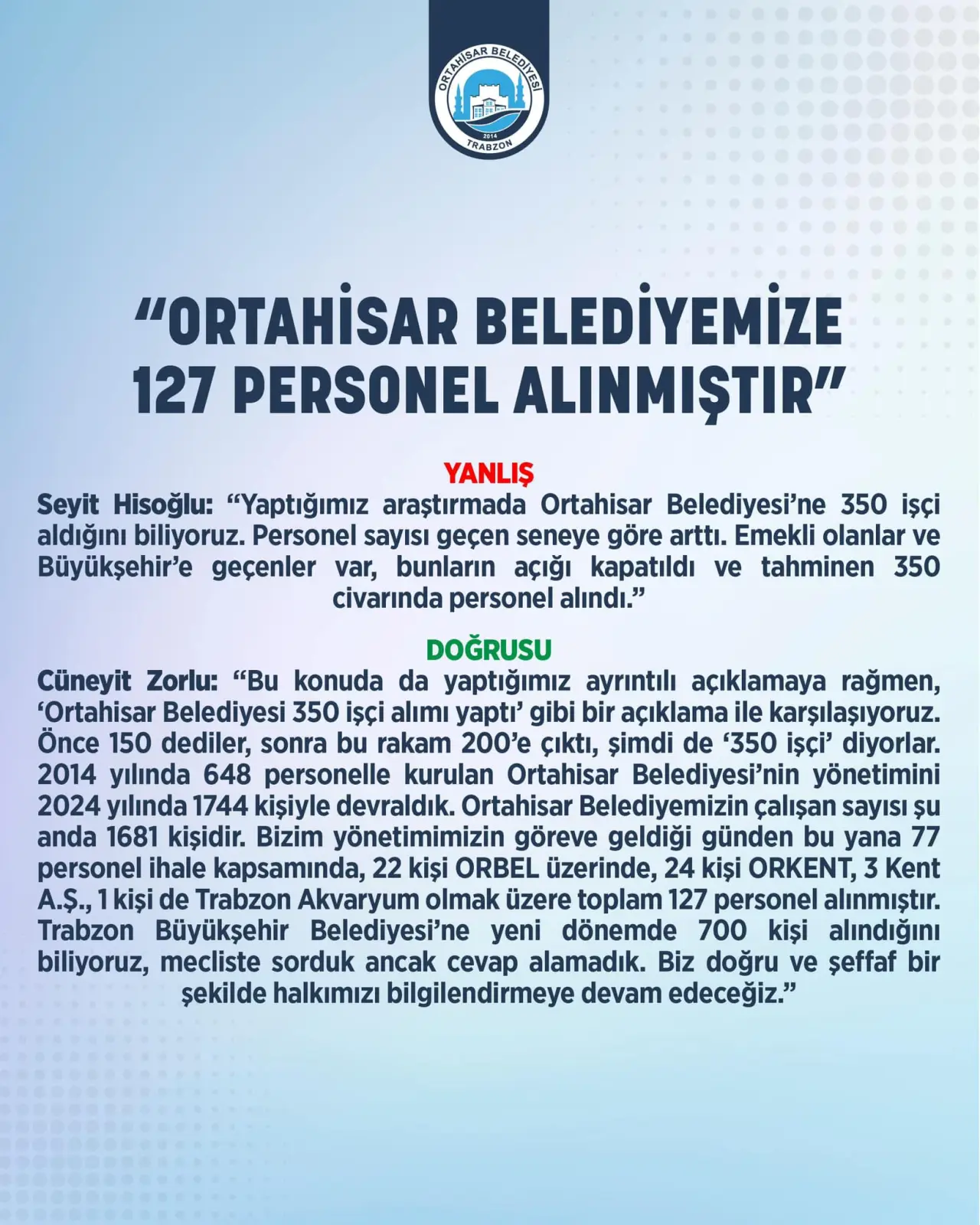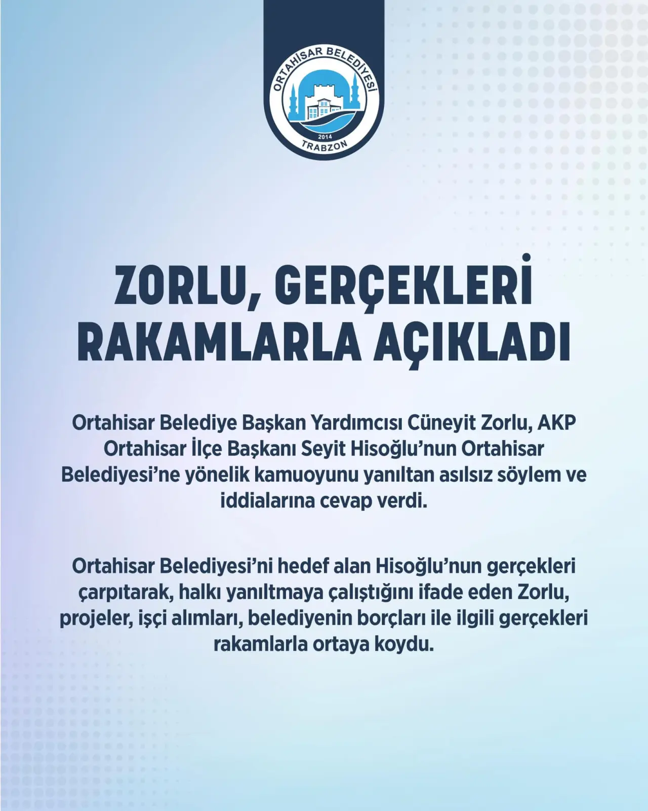 Trabzon Ortahisar Belediye Başkan Yardımcısı Cüneyit Zorlu, bazı çevreler tarafından kamuoyunu yanıltıcı biçimde dile getirilen iddialara açıklık getirdi. Başkan Yardımcısı Zorlu, belediyenin projeleri, personel yapısı ve mali durumu hakkında detaylı bilgiler paylaşarak, kamuoyunun doğru bilgilendirilmesini sağladı.