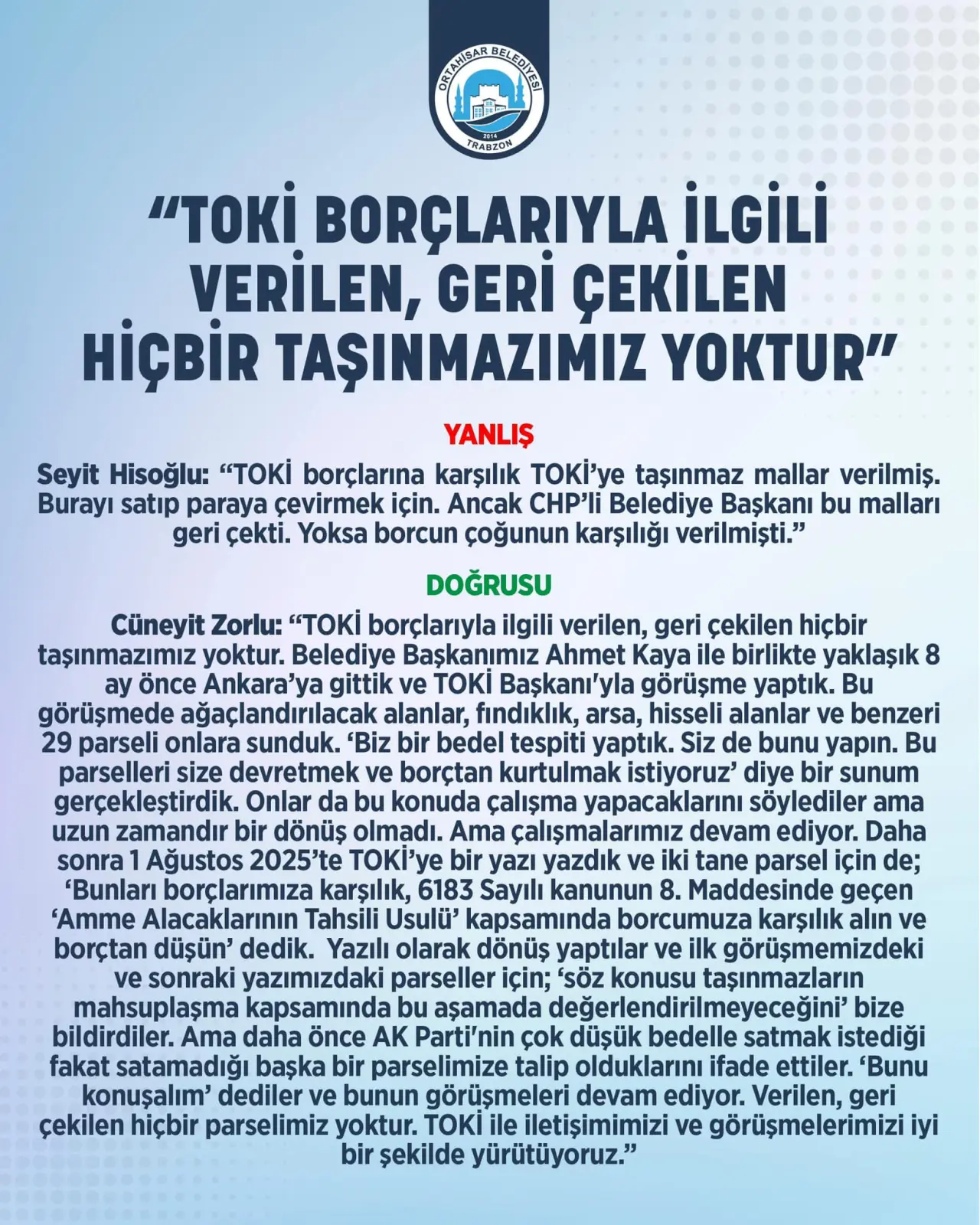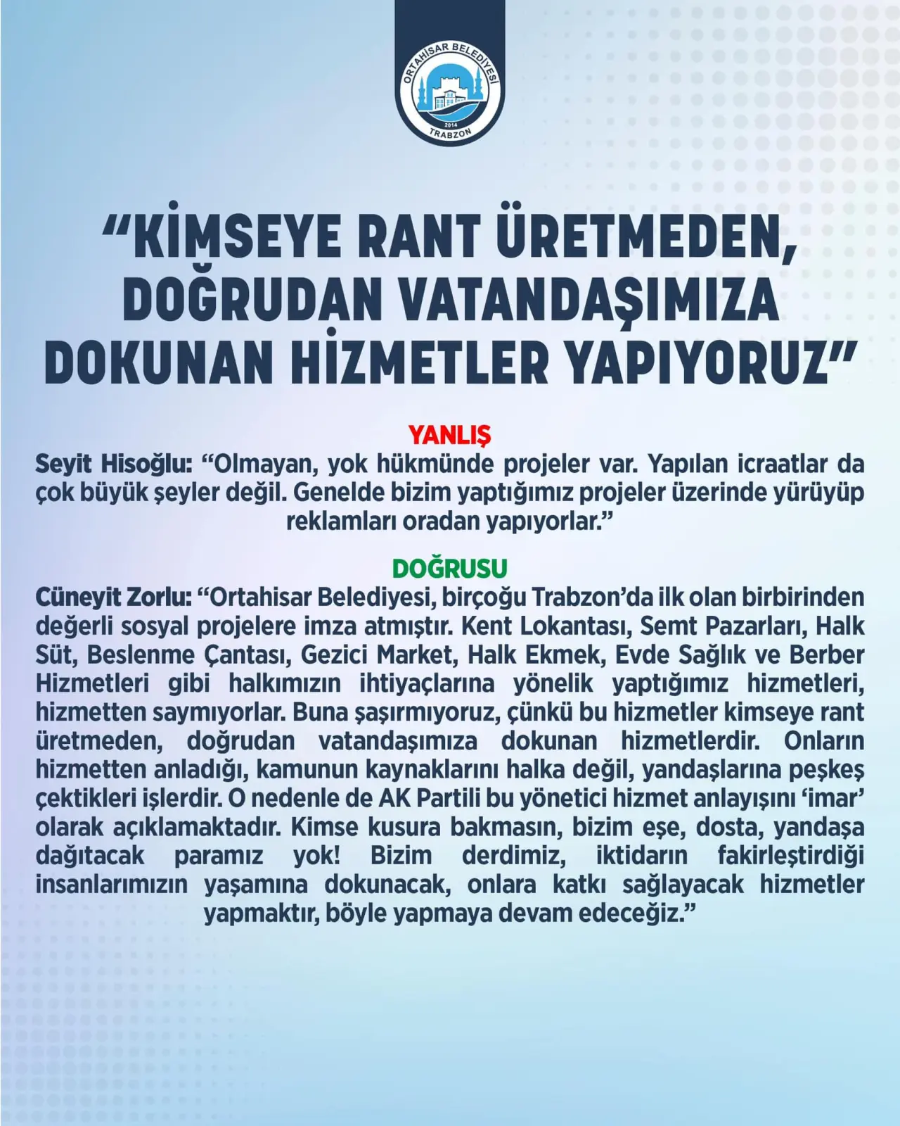 Ortahisar Belediyesi’nin tüm çalışmalarını şeffaf, adil ve kamu yararını gözeten bir yönetim anlayışıyla yürüttüğünü belirten Zorlu, belediyenin mali disiplin ve hizmet kalitesinden ödün vermeden çalışmalarına devam ettiğini vurguladı.