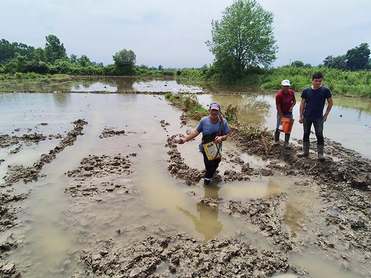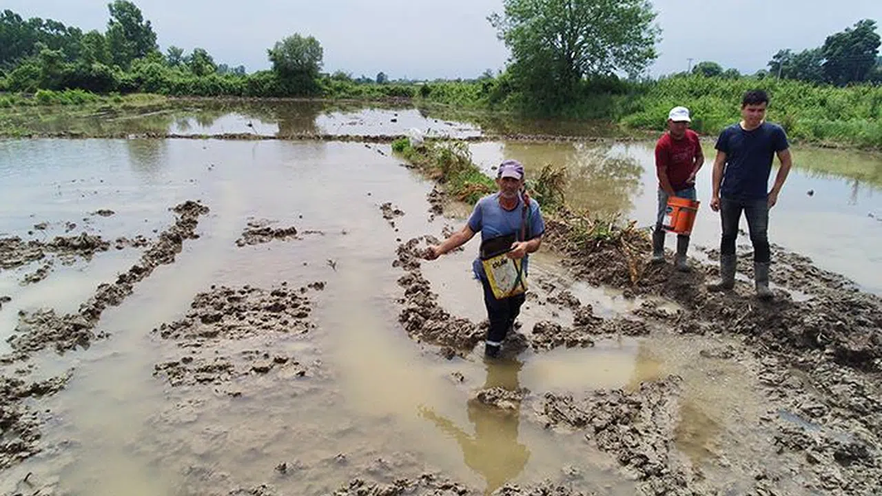 Ürün alım garantisi verilen çiftçilerin, sabahın erken saatlerinde geldikleri suyla dolu tarlalarda ekimine başladığı siyah pirinçten bu yıl yaklaşık 100-120 ton ürün elde edilmesi bekleniyor.