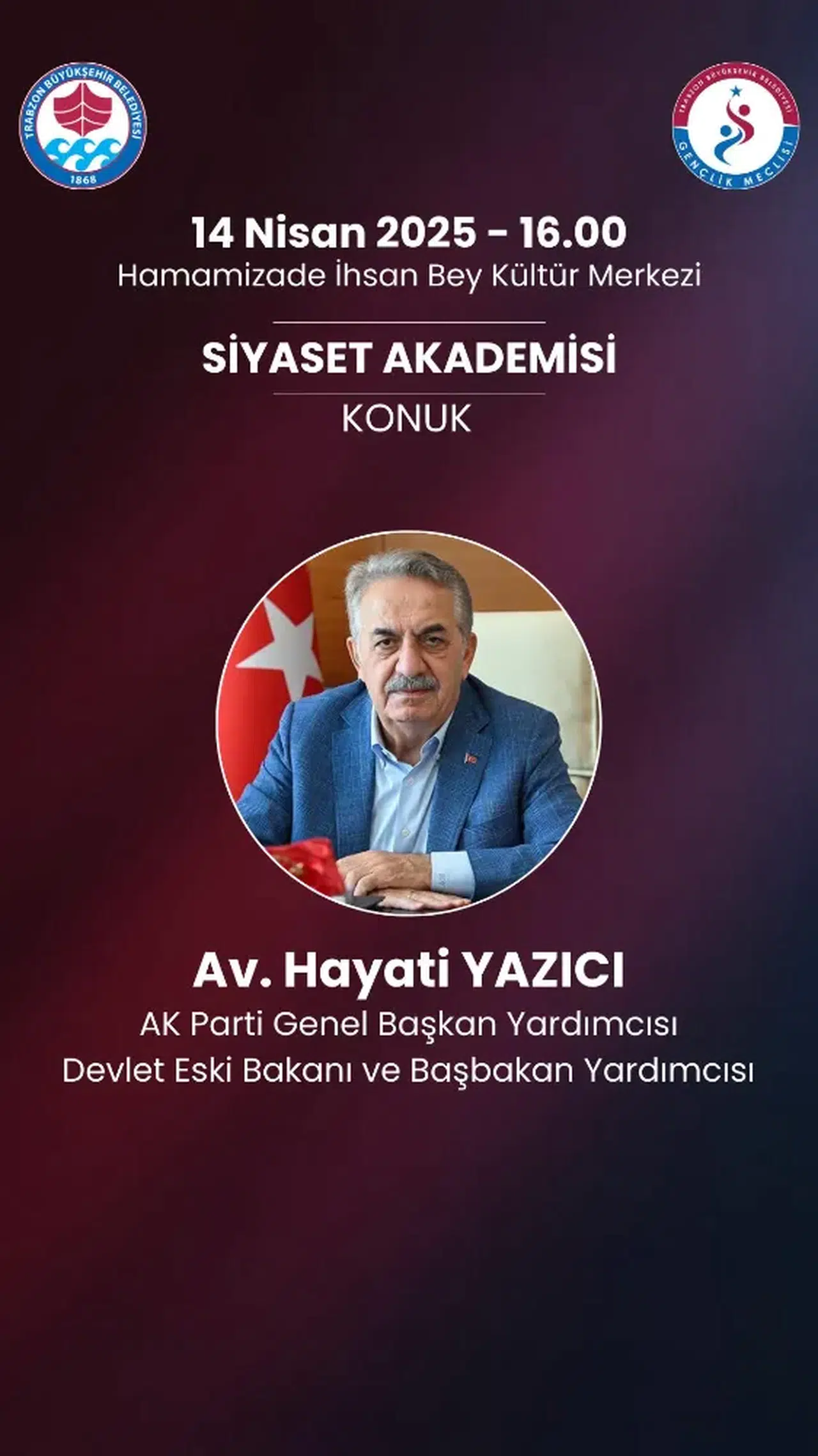 AK Parti Genel Başkan Yardımcısı ve geçmiş dönem Devlet Bakanı Hayati Yazıcı, Trabzon Büyükşehir Belediyesi Gençlik Meclisi tarafından düzenlenen Gençlik Akademileri’nin konuğu olacak.