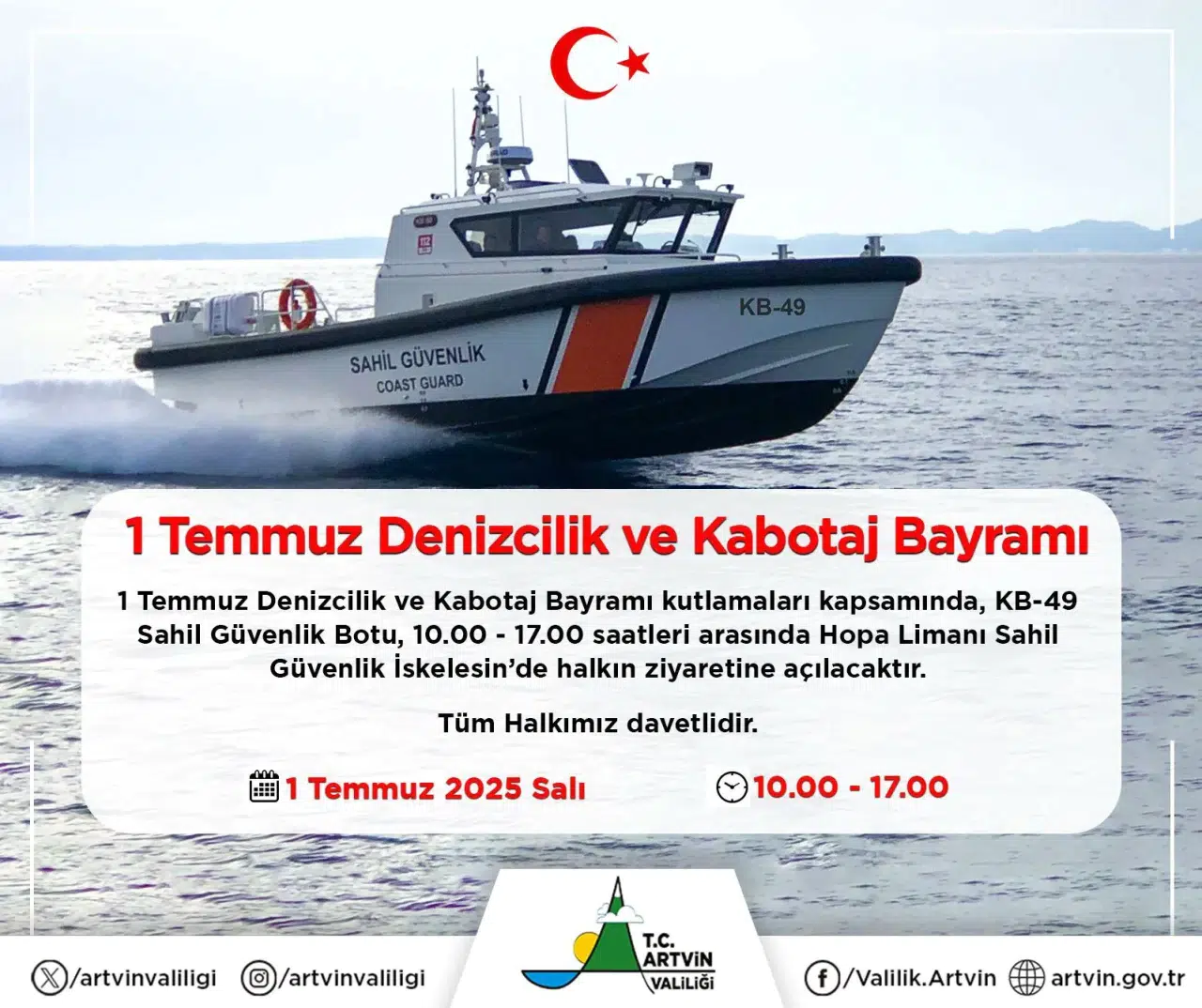 KB-49 Sahil Güvenlik Botu Halkın Ziyaretine Açılacak 1 Temmuz Denizcilik ve Kabotaj Bayramı dolayısıyla, Artvin’in Hopa ilçesinde bulunan KB-49 Sahil Güvenlik Botu, vatandaşların ziyaretine açılacak. Bu etkinlik, 1 Temmuz Salı günü, saat 10.00 ile 17.00 arasında gerçekleştirilecek. Hopa Limanı Sahil Güvenlik İskelesi’nde düzenlenecek olan etkinliğe, tüm halk davet ediliyor.