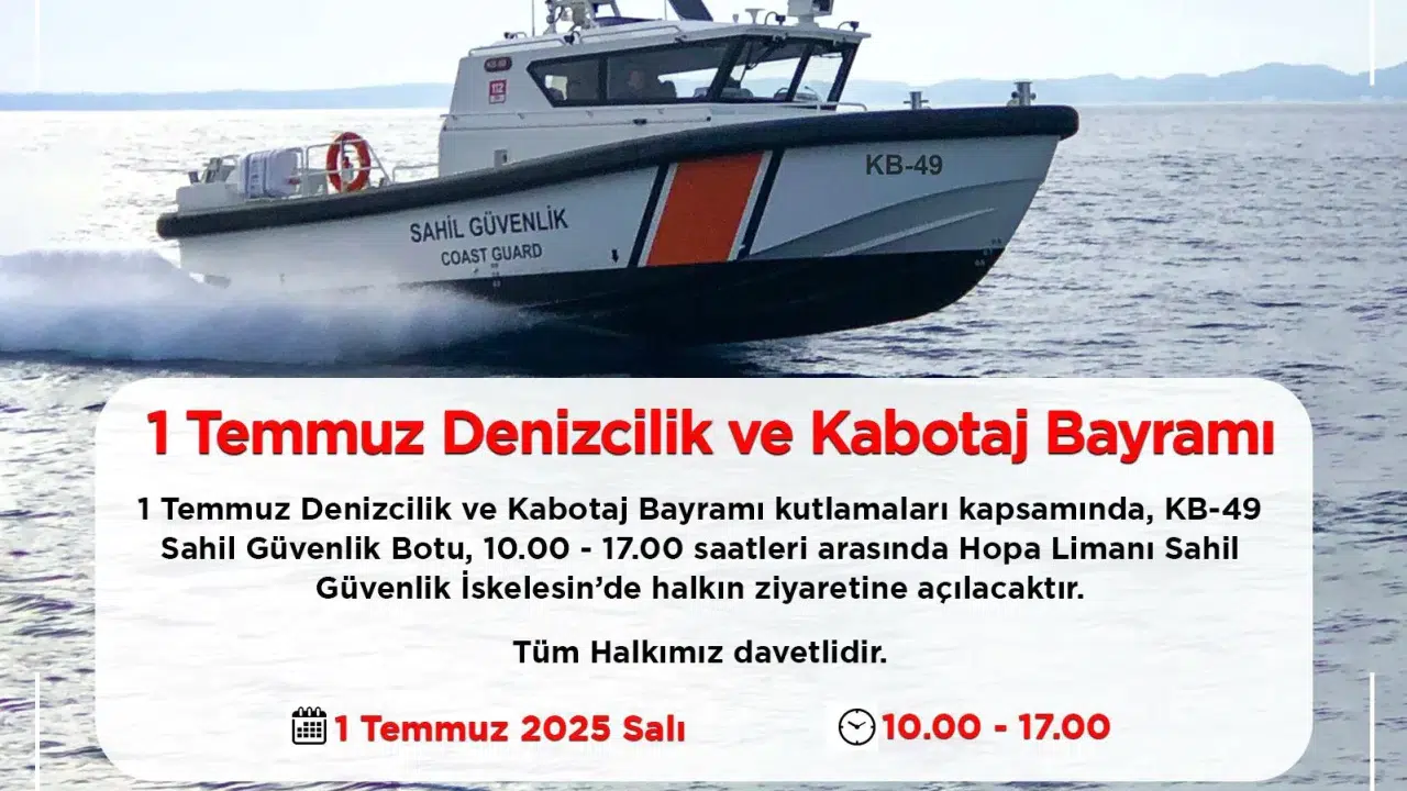 Bu yıl 1 Temmuz tarihinde yapılacak olan Denizcilik ve Kabotaj Bayramı etkinlikleri, denizciliğin önemine dikkat çekmek amacıyla her yıl düzenleniyor. KB-49 Sahil Güvenlik Botu, ziyaretçilere çeşitli bilgi ve hizmetler sunacak. Etkinlikte, botun işleyişi, görevleri ve deniz güvenliği konularında halkı bilgilendirmek hedefleniyor. Hopa Limanı'nda yapılacak bu anlamlı etkinlikte, vatandaşlar sahil güvenlik görevlerinin yanı sıra, denizcilik ile ilgili daha birçok konuda bilgi alabilecek..