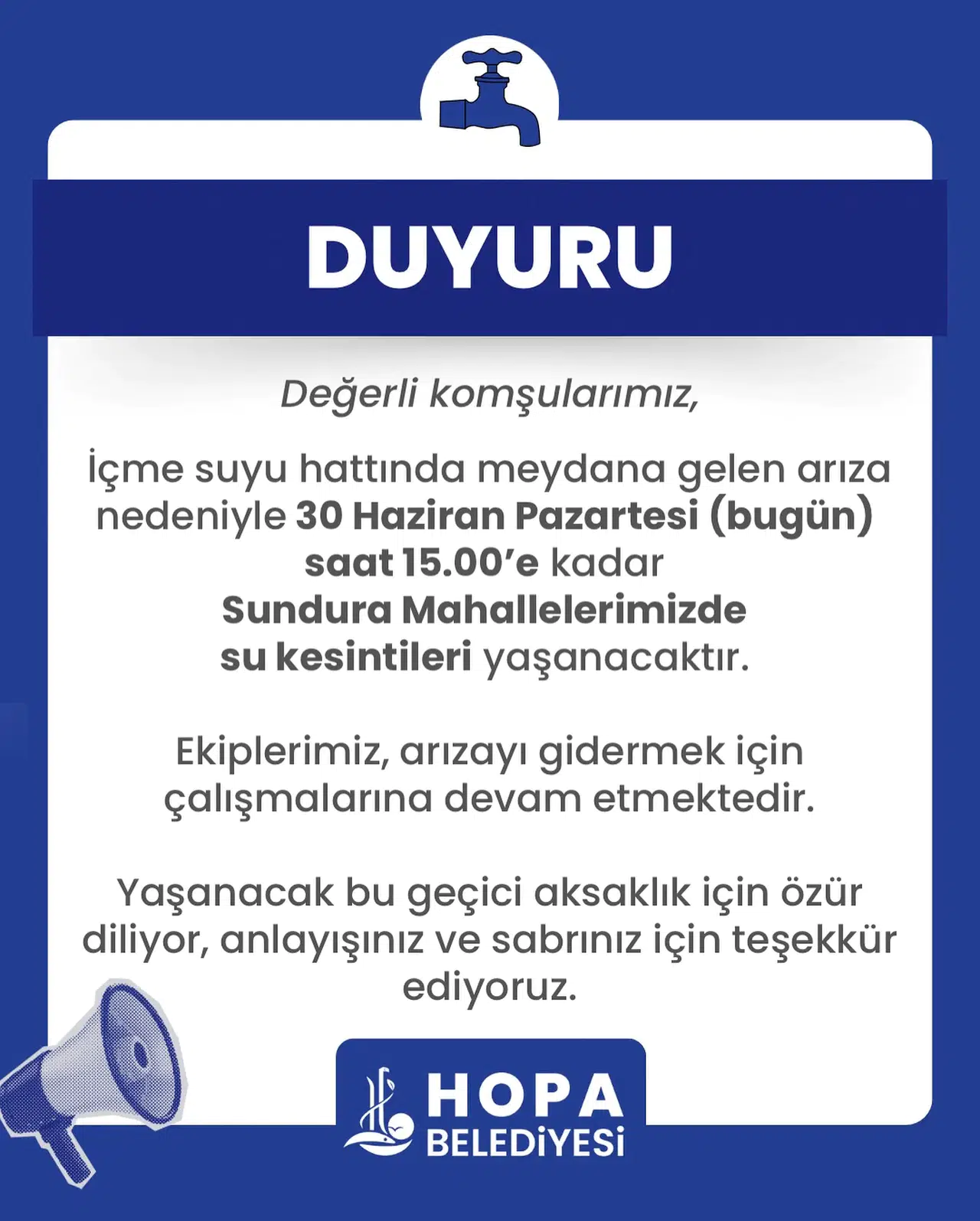 Hopa Belediyesi tarafından yapılan açıklamada, arızanın giderilmesi için saha ekiplerinin yoğun şekilde çalışmalarını sürdürdüğü belirtilerek, vatandaşlardan anlayışlı olmaları istendi. Kesintinin sadece belirli mahallelerde geçici bir süre için uygulanacağı ve en kısa sürede su hizmetinin normale döneceği ifade edildi.