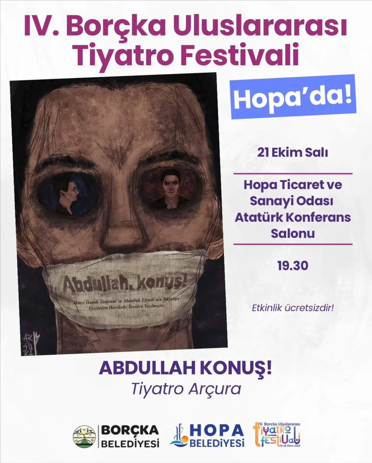Borçka Uluslararası Tiyatro Festivali'nde, Tiyatro Arçura'nın "Abdullah Konuş!" oyunu, 21 Ekim'de Hopa'da ücretsiz sahnelenecek. Ahmet Hamdi Tanpınar'dan esinlenen bu performans, tiyatroseverlere keyifli bir deneyim sunmayı hedefliyor.