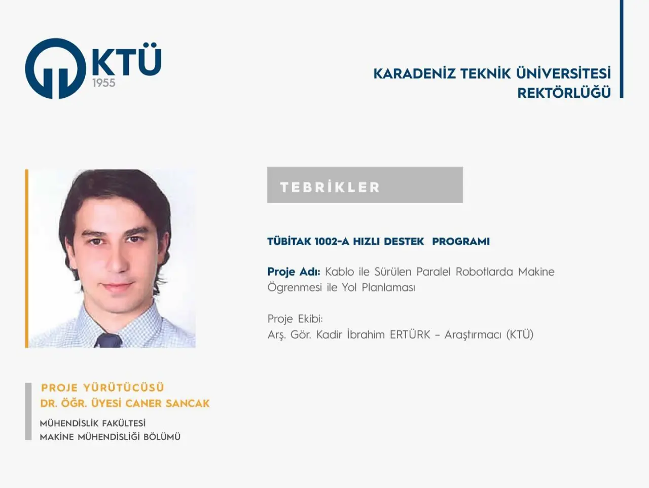 Karadeniz Teknik Üniversitesi (KTÜ) akademisyenlerinden Dr. Öğr. Üyesi Caner Sancak, yürüttüğü “Kablo ile Sürülen Paralel Robotlarda Makine Öğrenmesi ile Yol Planlaması” başlıklı projesi ile TÜBİTAK tarafından uygulanan 1002-A Hızlı Destek Programı kapsamında desteklenmeye hak kazandı.