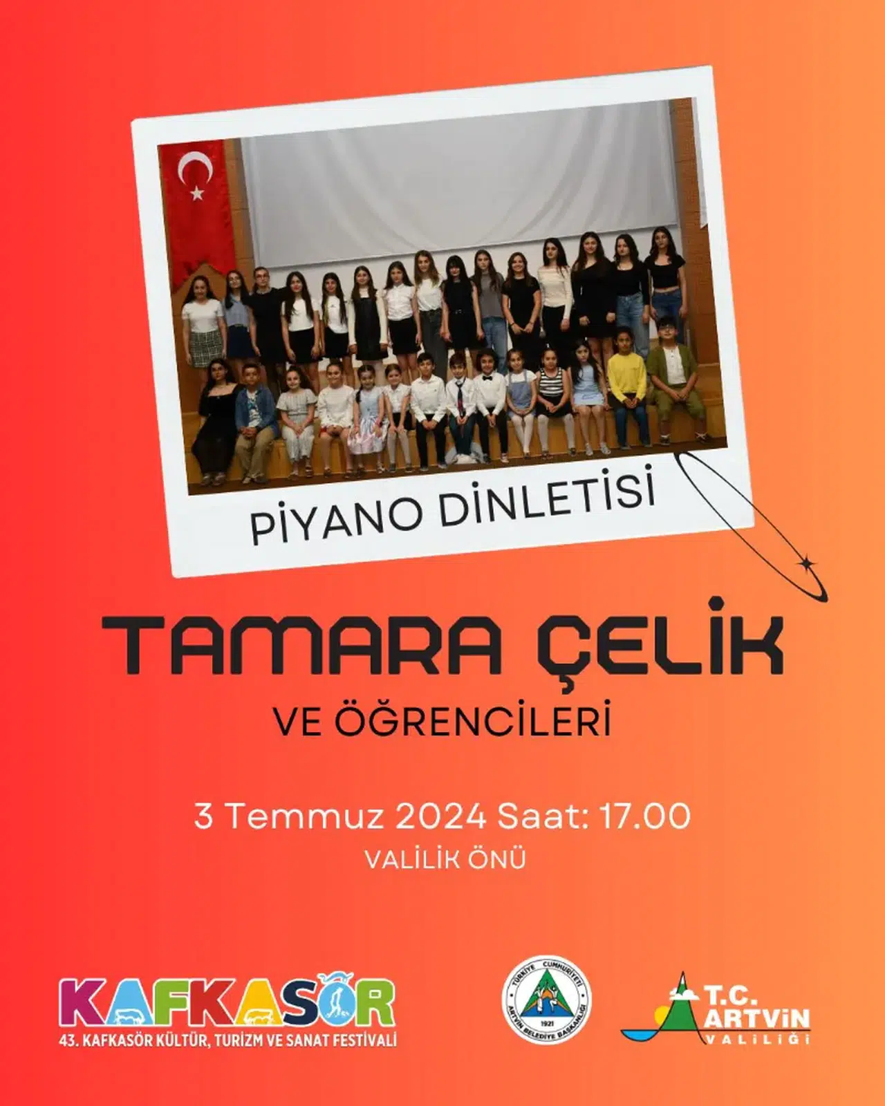 Artvin'in düzenlenecek olan Kafkasör Kültür, Turizm ve Sanat Festivali kapsamında, piyano eğitmeni Tamara Çelik ve öğrencileri tarafından özel bir piyano dinletisi gerçekleştirilecek. Etkinlik, 3 Temmuz Çarşamba günü saat 17.00'de Valilik önünde festivalin açılış programının ardından başlayacak.