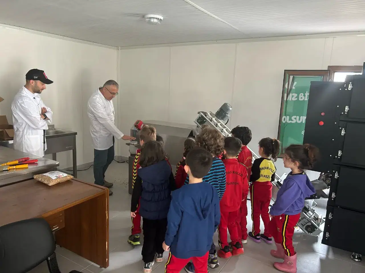Tesis sorumlusu Mustafa Mankan, öğretmenleriyle birlikte tesisi ziyaret eden miniklere, mama üretiminde kullanılan malzemelerin nasıl ve nereden toplandığını, bu malzemelerin hangi işlemlerden geçirilerek mamaya dönüştürüldüğünü anlattı.
