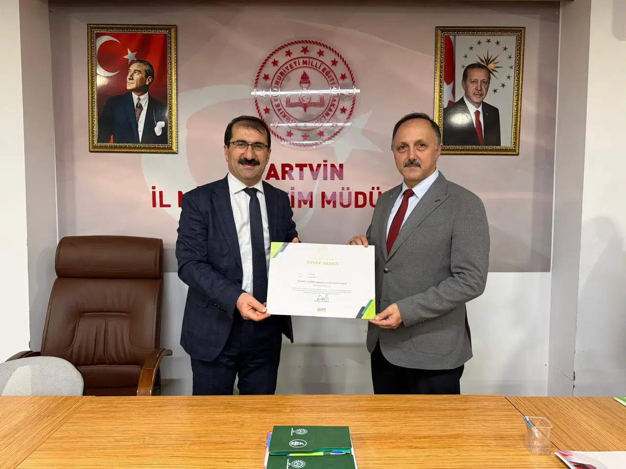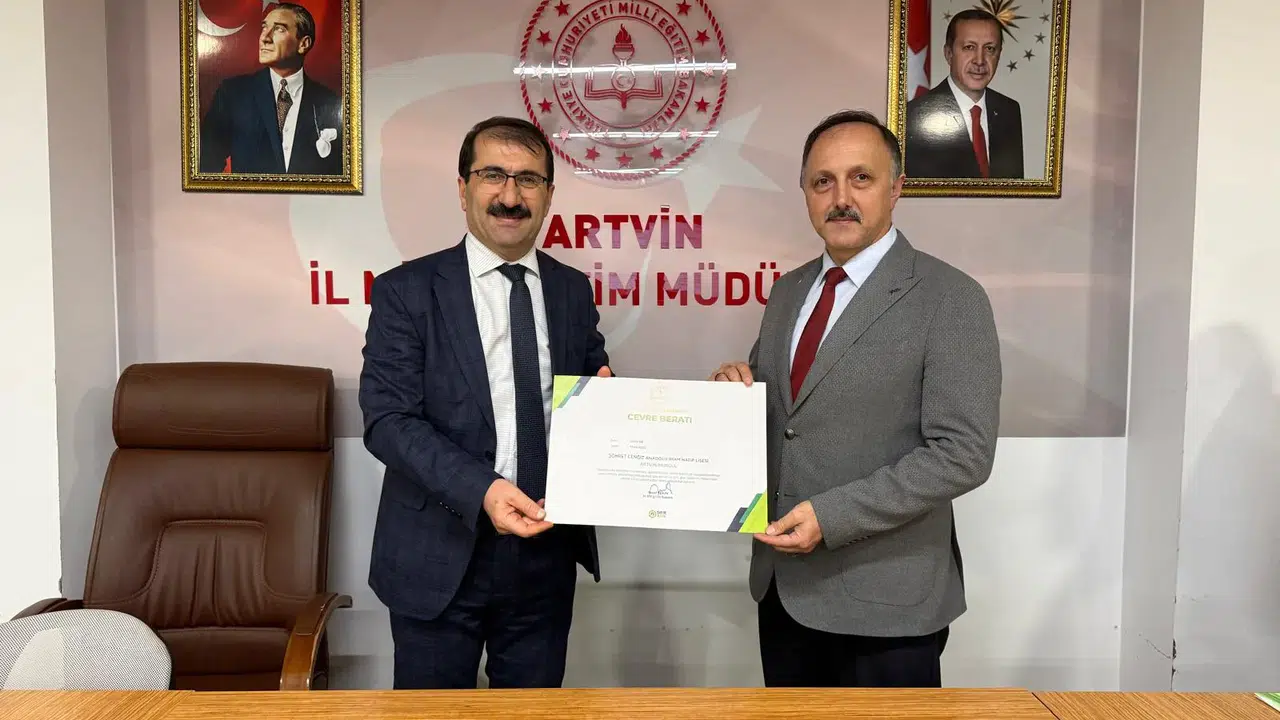 Başarı kapsamında, Millî Eğitim Bakanı’nın imzasını taşıyan Çevre Beratı, Artvin İl Millî Eğitim Müdürü Fahri Acar tarafından, okul müdürüne iletilmek üzere Murgul İlçe Millî Eğitim Müdürü Engin Gümüş’e takdim edildi.