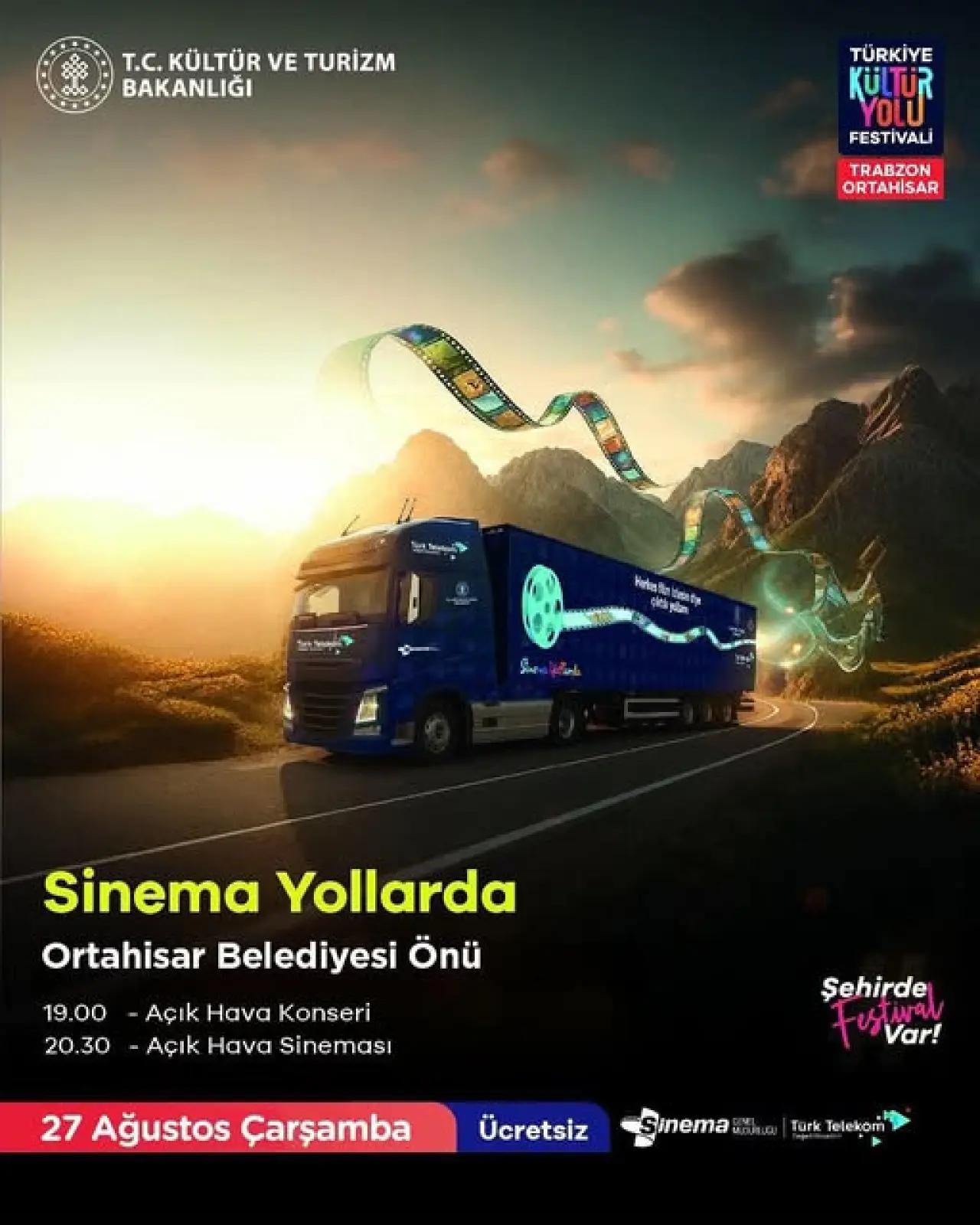 Türkiye Kültür Yolu Festivali kapsamında düzenlenen “Sinema Yollarda” projesinin yeni durağı Trabzon Ortahisar olacak. Bu etkinlik, sanatseverlerin ve sinema tutkunlarının bir araya gelerek keyifli anlar yaşamasını sağlayacak olan Ortahisar Belediyesi'nin ev sahipliğinde gerçekleştirilecek.