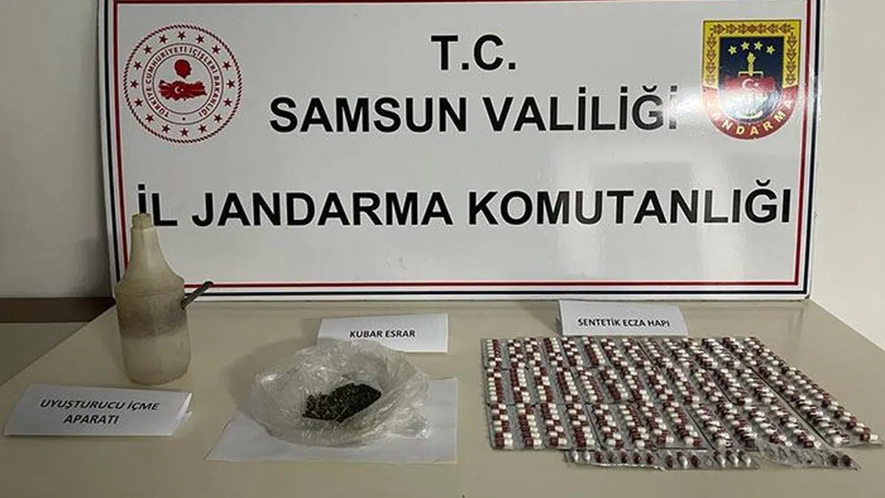 Adreste arama yapan ekipler, 309 sentetik ecza hapı, 55 gram kubar esrar ve uyuşturucu kullanma aparatı ele geçirdi.