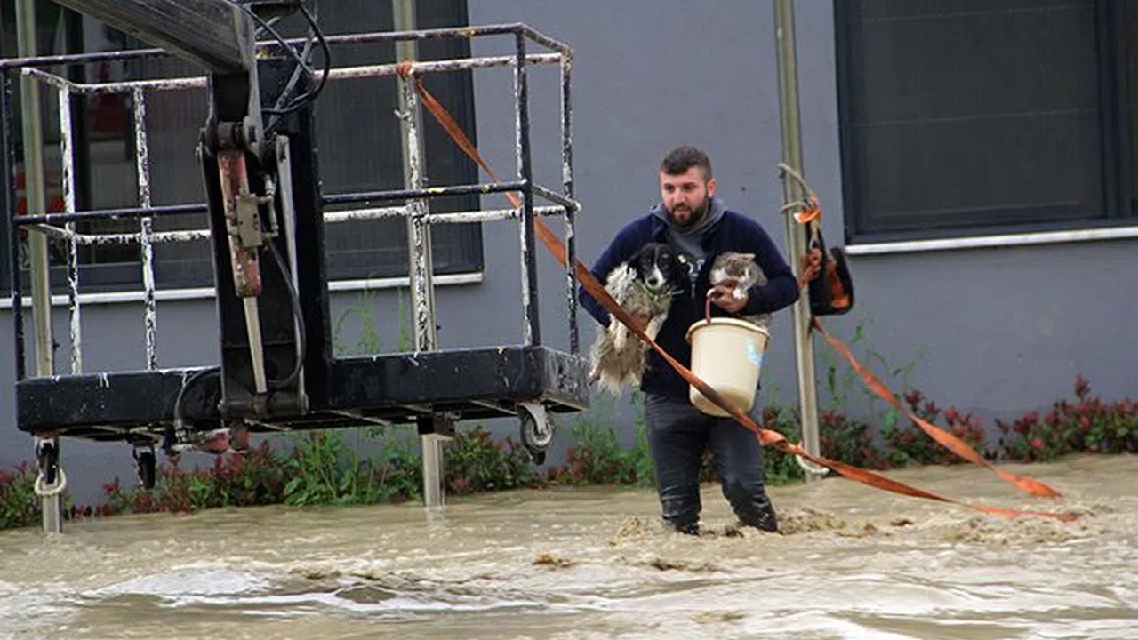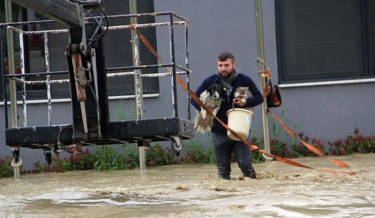 Görevliler vinç yardımıyla tesise girerek, evcil hayvanları bulundukları yerden alıp güvenli bölgeye taşıdı.