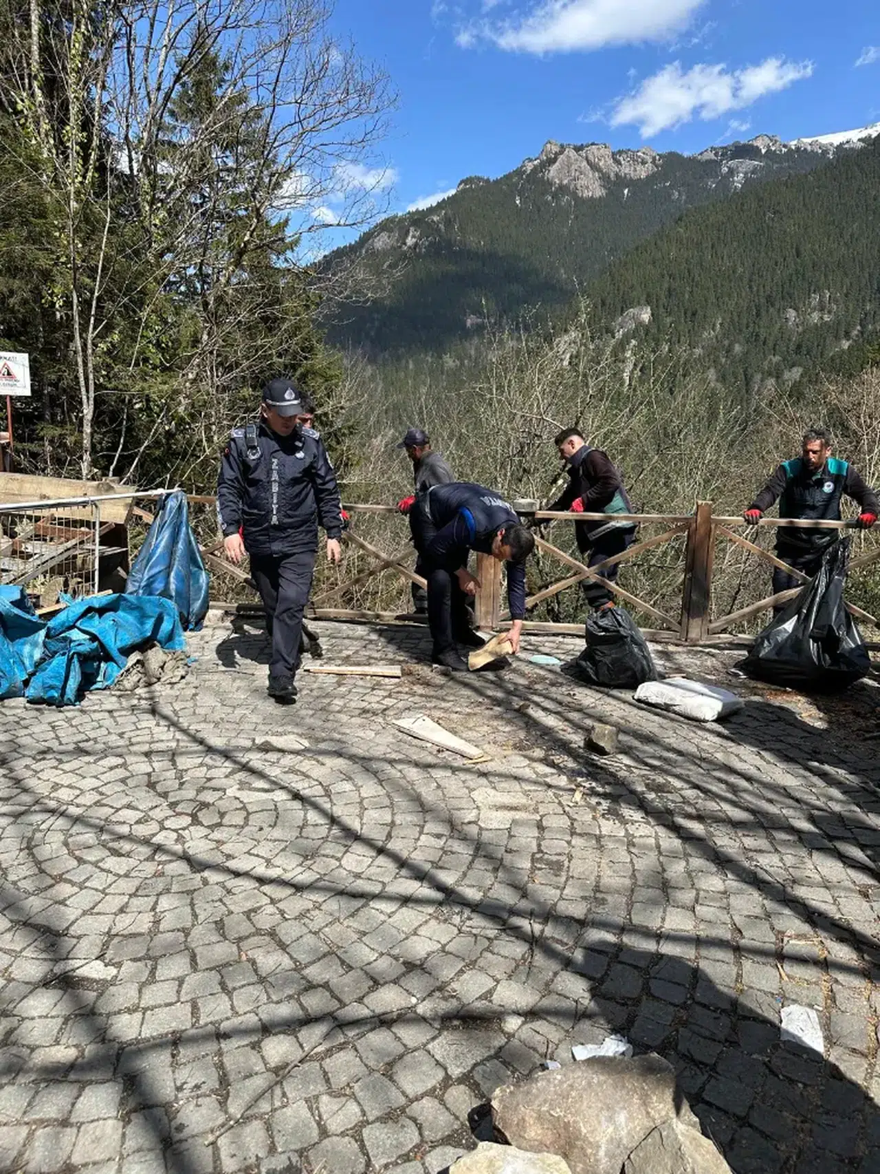 Trabzon Büyükşehir Belediyesi zabıta ekipleri, Sümela Manastırı çevresinde seyyar satış yapanlara ait tezgahları kaldırdı.
